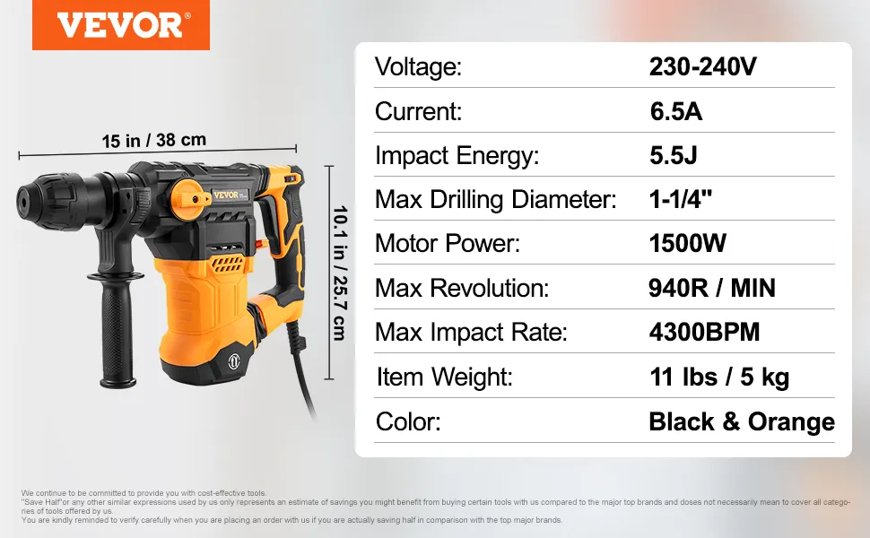 Multifunctional: VEVOR's heavy-duty drill set includes 3pcs drill bits, 1pcs flat chisel, 1pcs point chisel, 1pcs grease, 2pcs carbon brushes,1pcs unique dust cover, 1pcs wrench, 2pcs depth gauge, 1pcs portable carrying case. Add grease regularly for proper functioning and extended hammer drill life. The rotary hammer will make it an easy job, no matter removing tiles or demolishing brickwork. And it is suitable for wood, masonry, concrete, brick, and metal. It is also ideal for professional or daily home users.