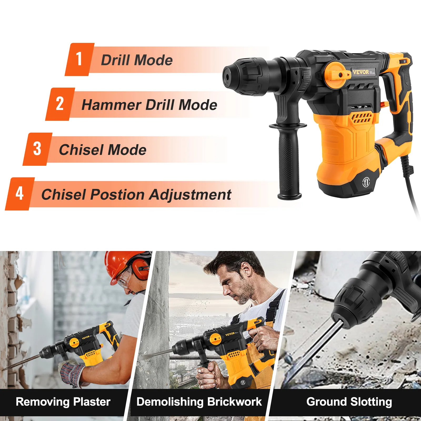 VEVOR 1-1/4 Inch SDS-Plus Rotary Hammer Drill, Corded Drills Heavy Duty Chipping Hammers with Vibration Control, Electric Demolition Hammers Variable Speed, Power Tool