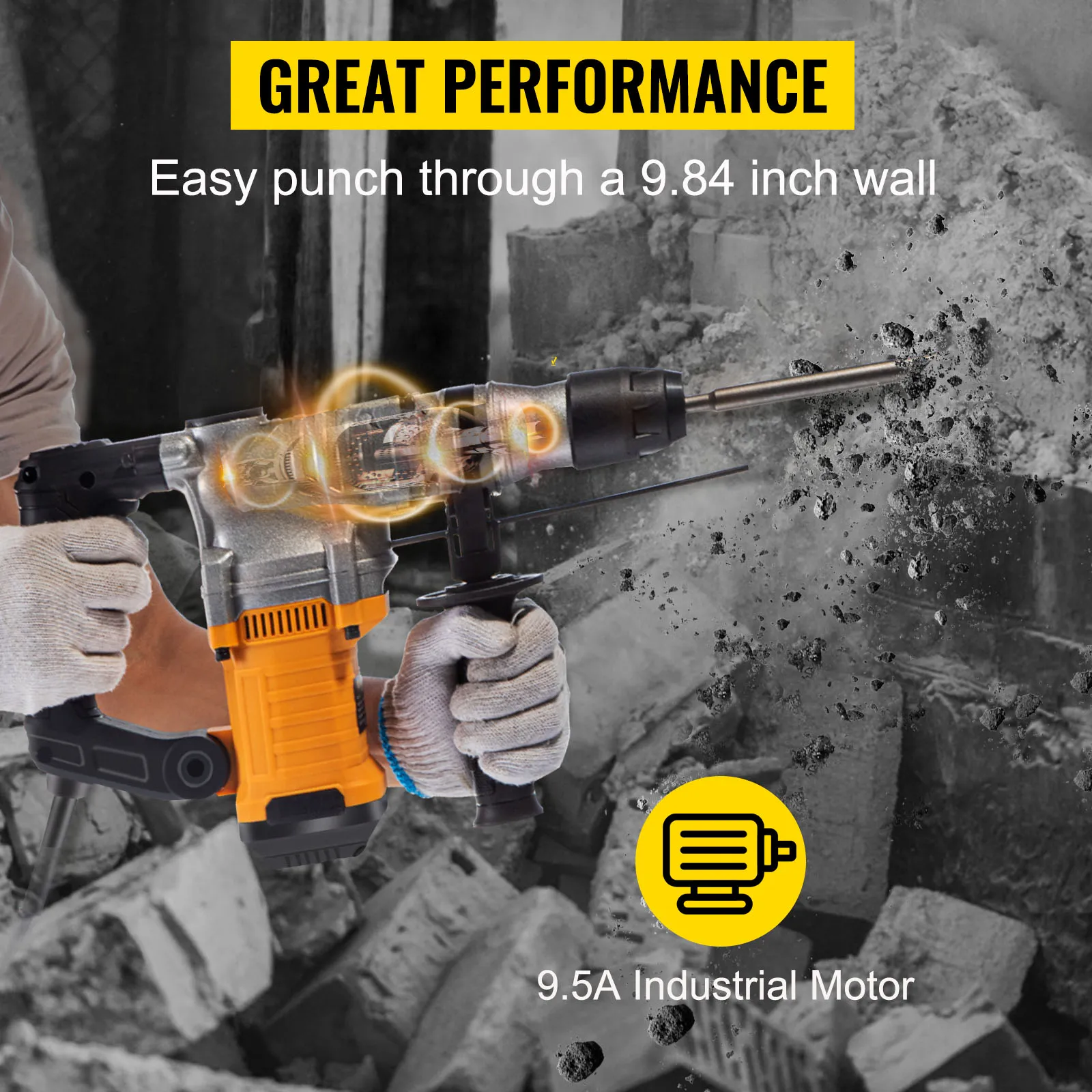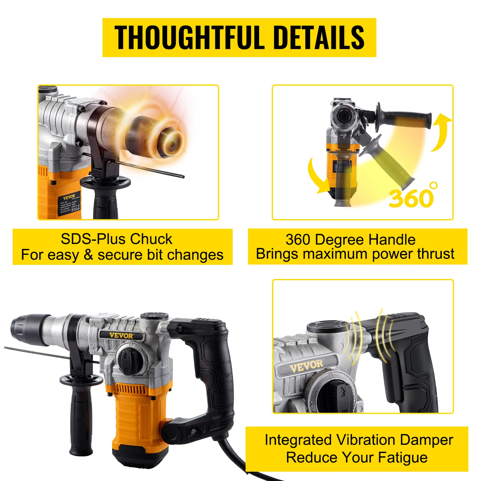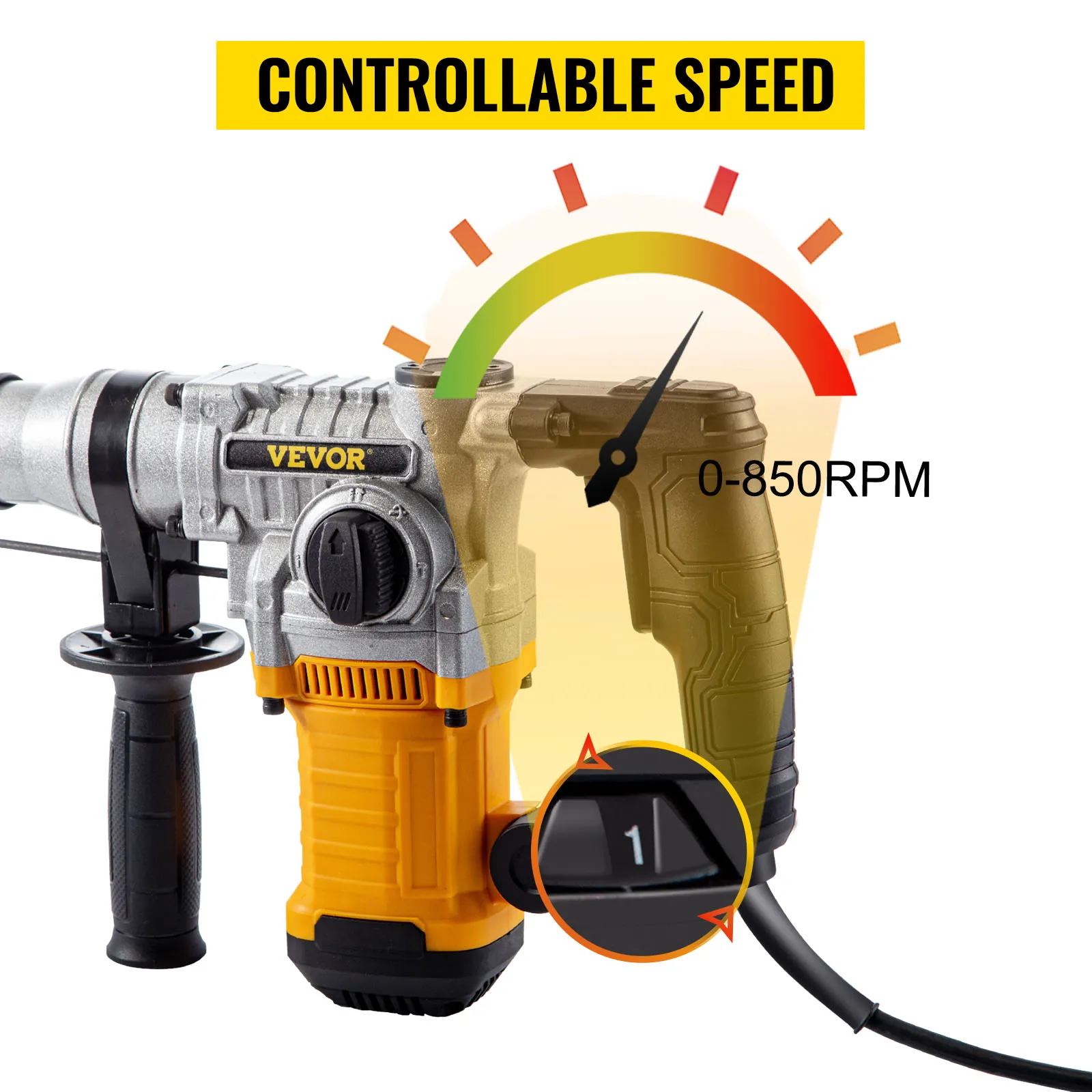 The rotary drill with a powerful 9.5 amp motor and 6.5 joules impact rate let you finish many projects on masonry, concrete, brick, stone, etc. The heat-proof copper wire motor can work for a long time without burning out the machine.