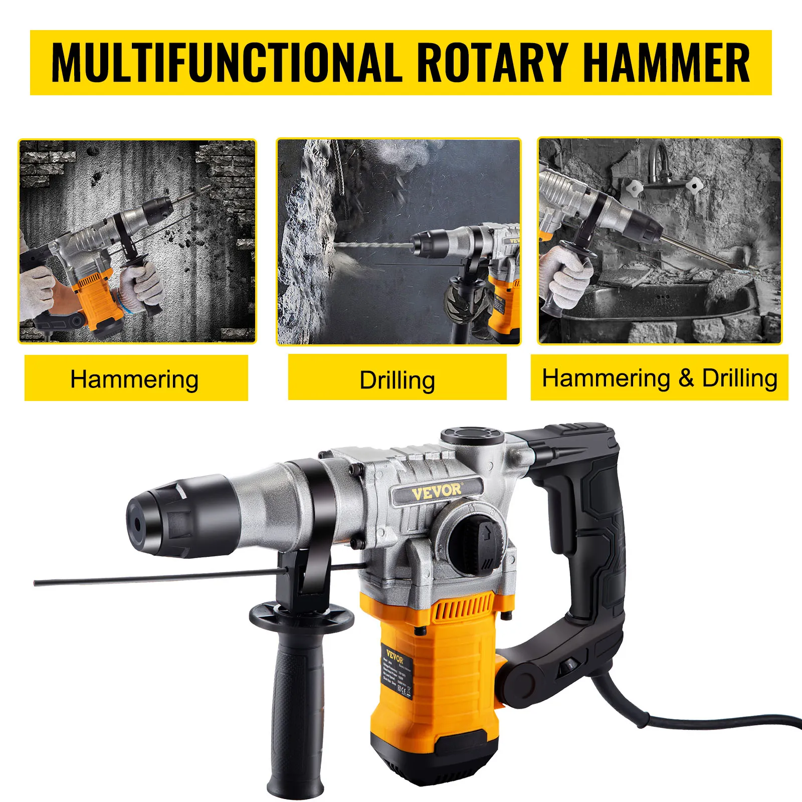 Our heavy-duty corded rotary hammer applies to various working like dismounting walls, breaking floors, decorating houses, etc. With a sound heat dissipation system, the corded rotary hammer drill's motor will not be in high temperature even after a long time working. Four different functions of the drill, hammer, hammer drill, and chisel adjustment functions adapt to various work scenarios that are easy to switch.