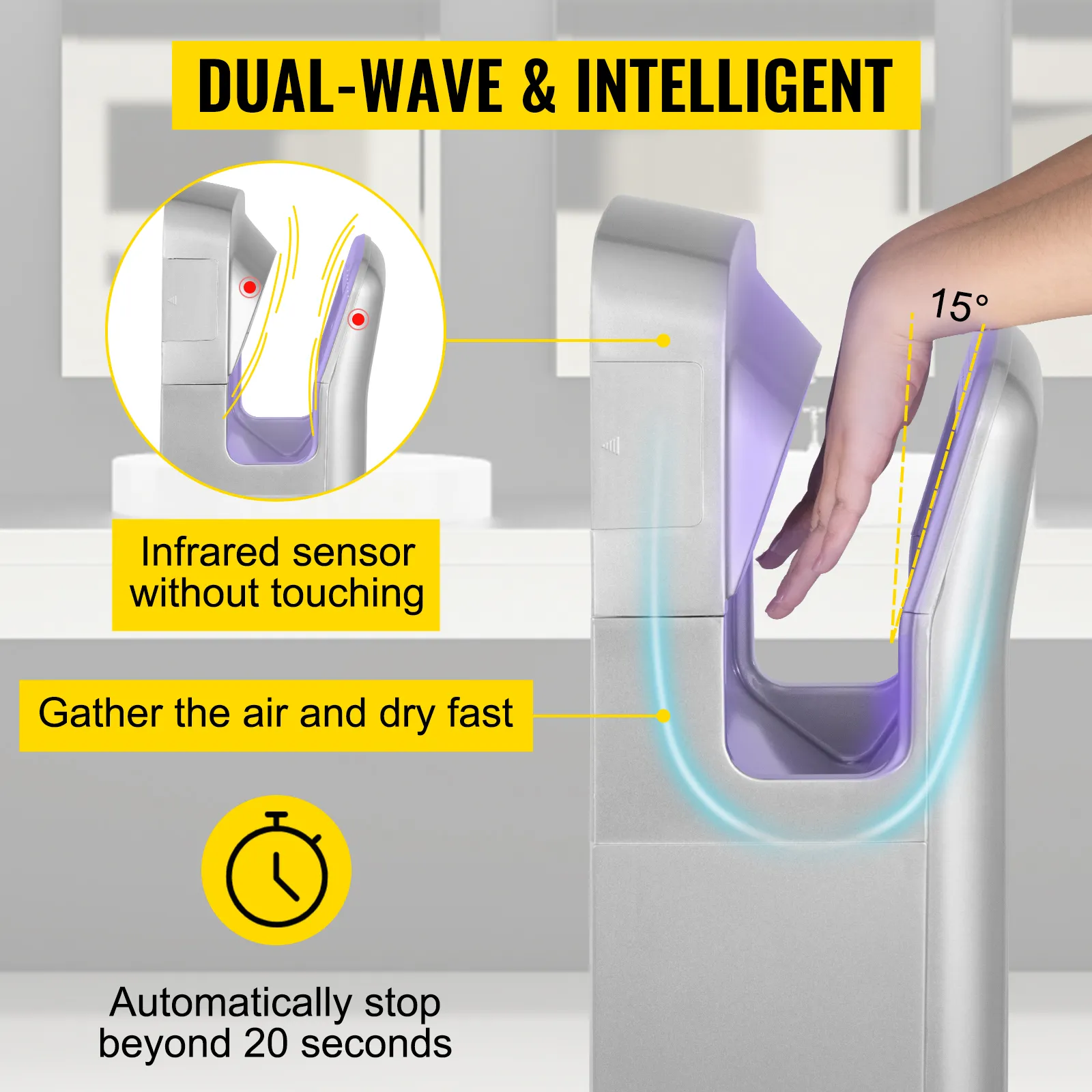 Our commercial dryer has a fashionable silver surface with a smooth surface. Besides, with the stable and durable ABS construction, the hand dryer is easy to maintain.