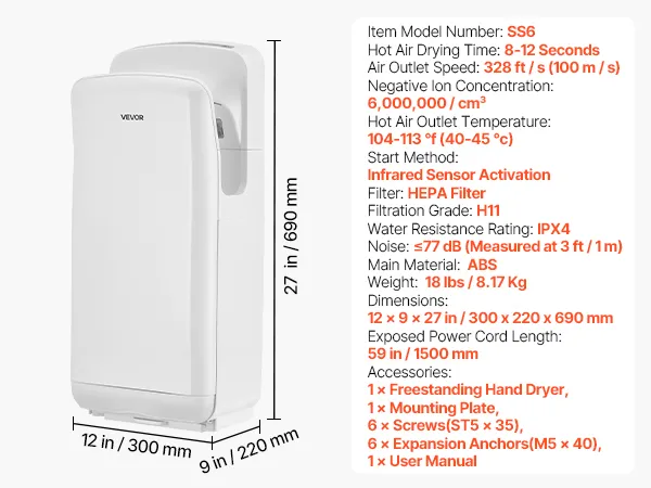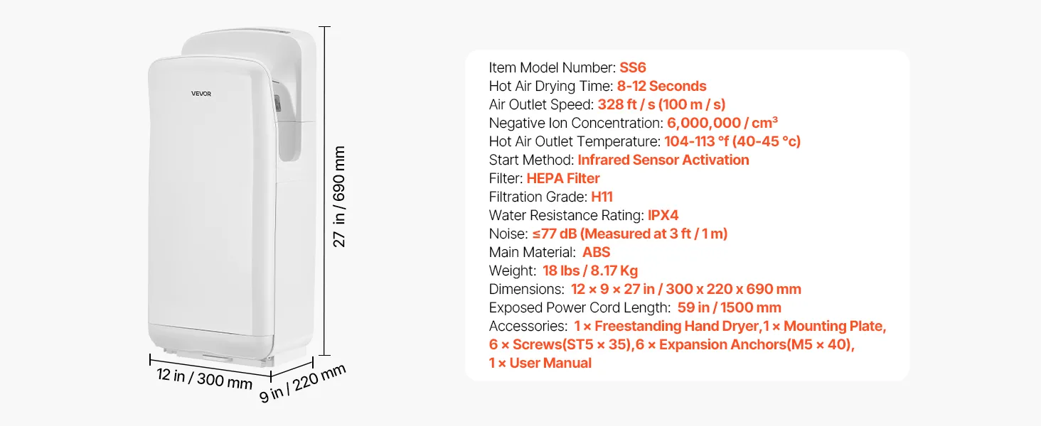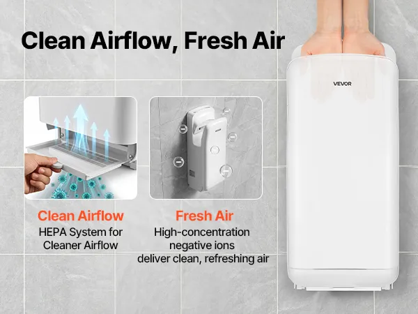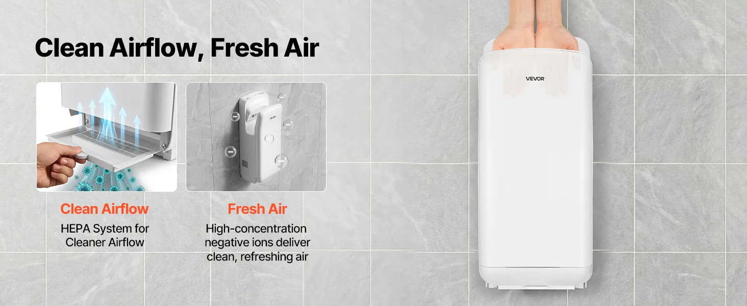 Hygienic Air Protection: Built-in HEPA filtration system creates a cleaner drying condition. High-concentration negative ions help freshen the surrounding air, making this hand dryer a reliable solution for public and commercial spaces