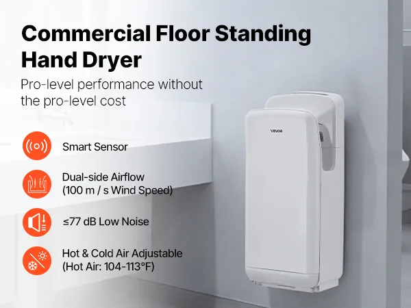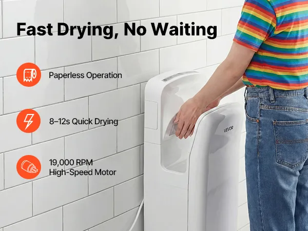 Fast Drying Power: High-speed drying with AC200–240V, 50/60Hz and 1950W power. Equipped with a 19,000 RPM motor and airflow up to 100 m/s, this vertical hand dryer delivers warm air drying in just 8–12 seconds, reducing wait time in busy restrooms