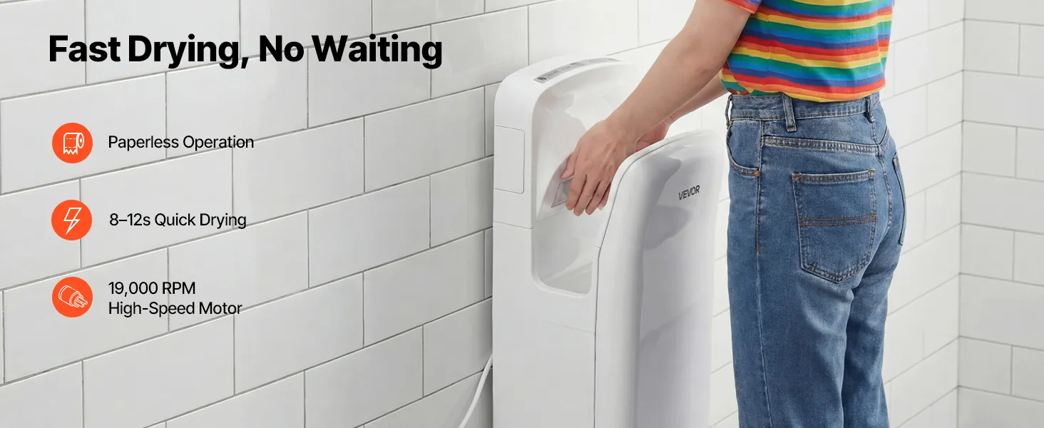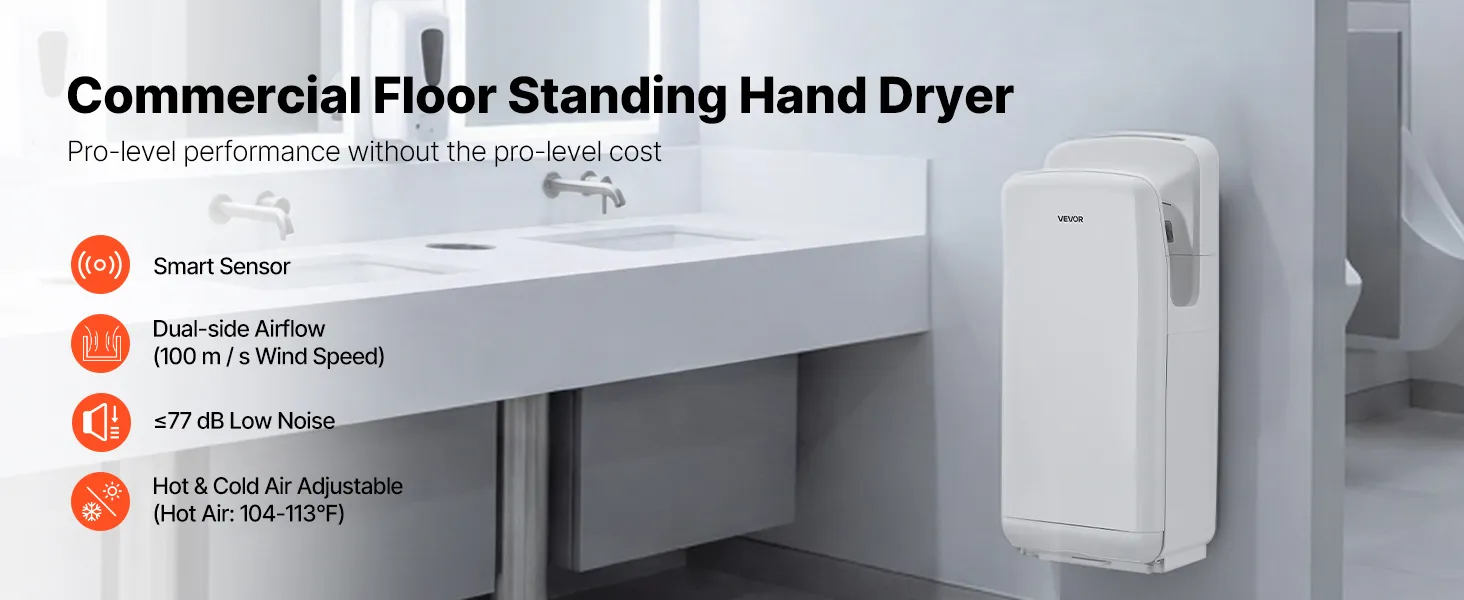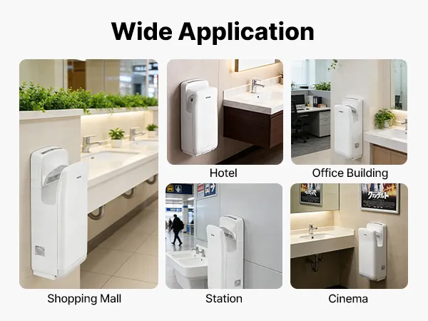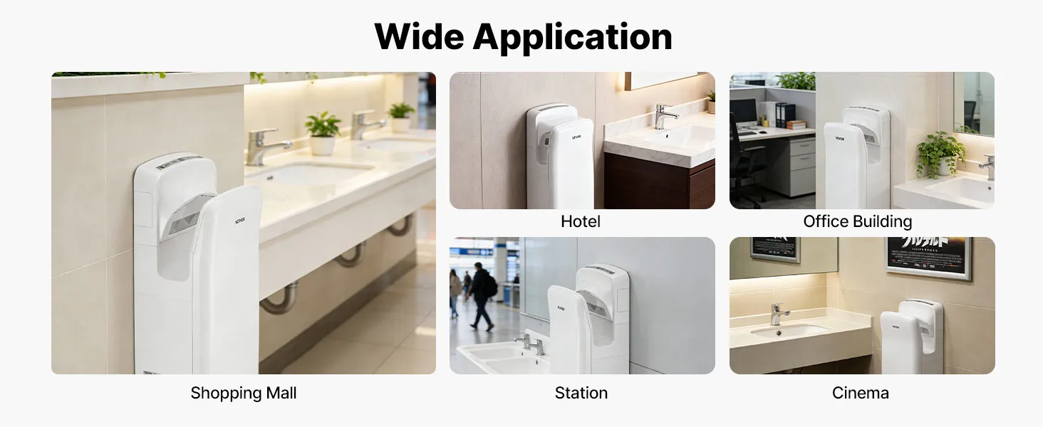 Versatile Application: Ideal for malls, offices, hotels, hospitals, airports, schools, and more. This automatic hand dryer delivers reliable, high-speed performance to meet hand-drying needs across various commercial and public settings