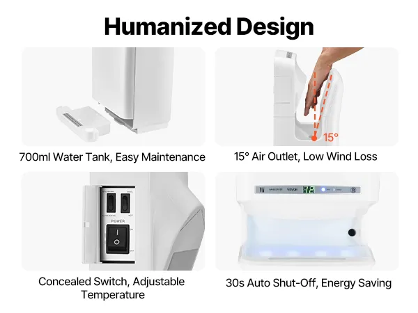User-Friendly Design: Dual-side infrared sensors activate instantly. Dual-axis airflow reduces splashing and air loss. This bathroom hand dryer features a 700 ml detachable water tank, hidden power switch, and 30-second auto shut-off