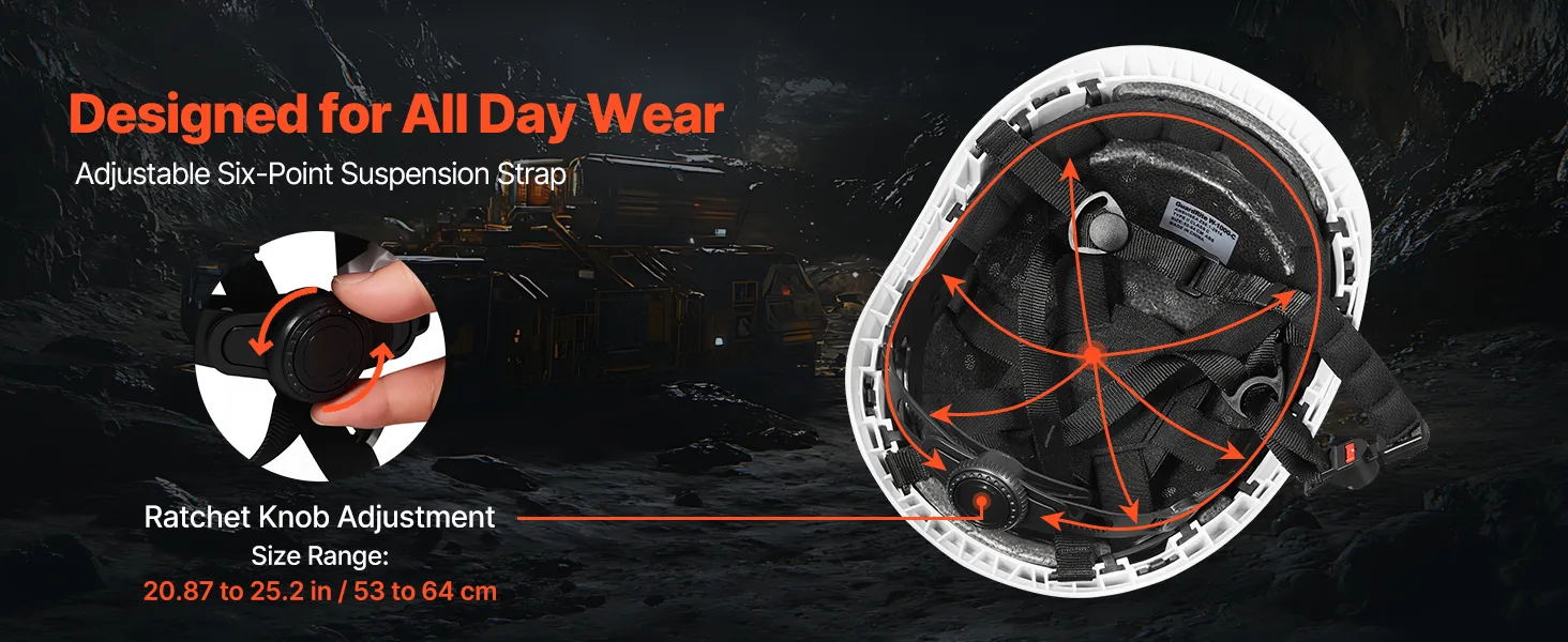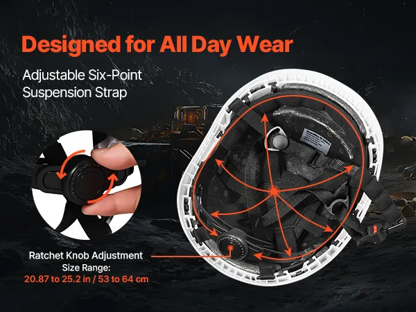 Stay comfortable all day with a 6-point suspension and easy-turn ratchet knob. Our hard hat helmet adjusts smoothly to fit head sizes 20.87 to 25.2 in/53 to 64 cm, ensuring a snug and stable feel on any job.