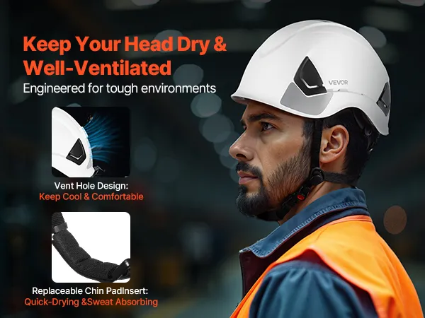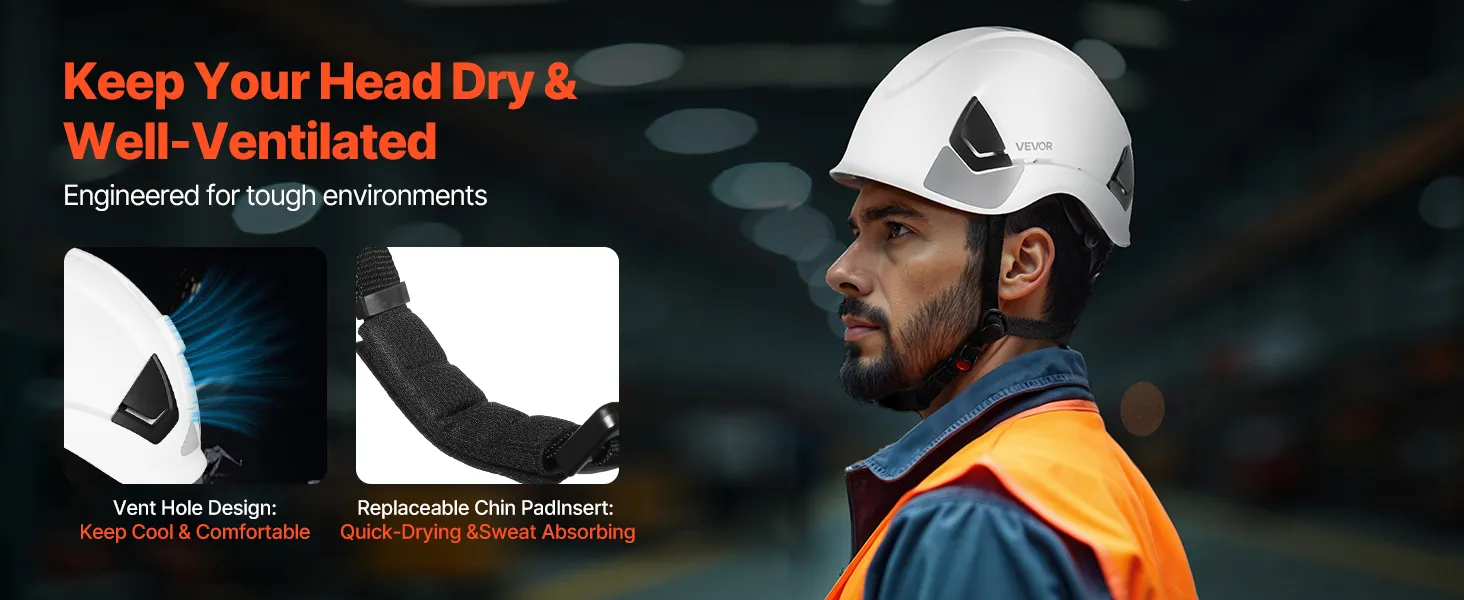 This helmet’s built-in vents improve air circulation, helping you stay cool. Paired with a quick-dry chin cushion that absorbs sweat, our safety helmet hard hat ensures a breathable and dry fit in any weather.
