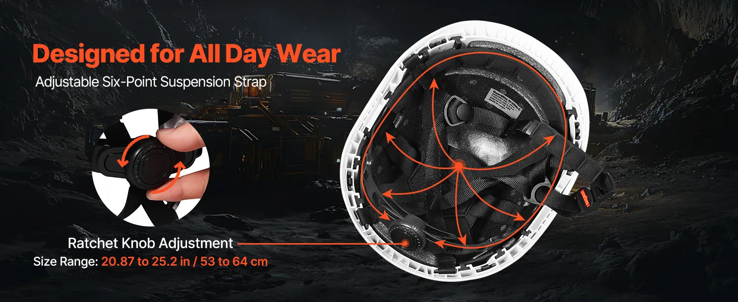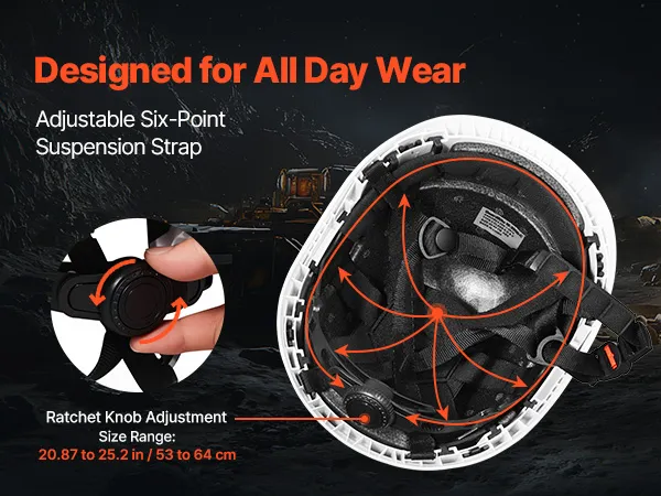 Stay comfortable all day with a 6-point suspension and easy-turn ratchet knob. Our hard hat helmet adjusts smoothly to fit head sizes 20.87 to 25.2 in/53 to 64 cm, ensuring a snug and stable feel on any job.