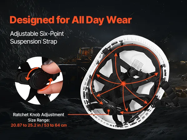 Stay comfortable all day with a 6-point suspension and easy-turn ratchet knob. Our hard hat helmet adjusts smoothly to fit head sizes 20.87 to 25.2 in/53 to 64 cm, ensuring a snug and stable feel on any job.