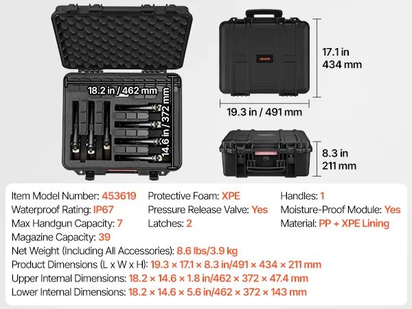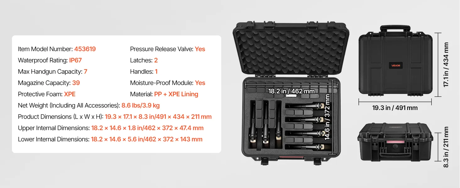 VEVOR Hard Pistol Case, Heavy Duty Hard Gun Case with XPE Foam Lining, Waterproof Pistol Storage Box with Customizable Interior & Handle for Gun, Lenses, Camera, Gear, TSA Compliant, 491x434x211 mm