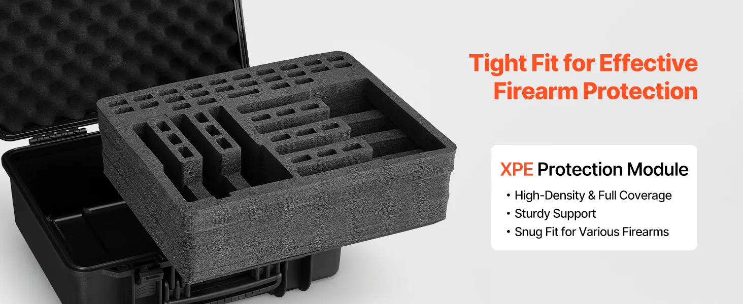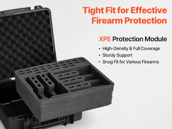 Customizable Modular: The hard gun case features detachable XPE modules for flexible storage. Expandable modules hold cleaning kits, timers, gloves, earmuffs and safety glasses. XPE modules with top egg-crate foam provide double protection and easy access