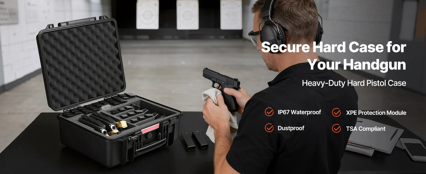 Built with a rigid PP shell and XPE modular foam, the hard pistol case keeps pistols and magazines well protected, making them a good choice for long-term firearm storage and secure travel transport.