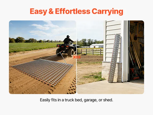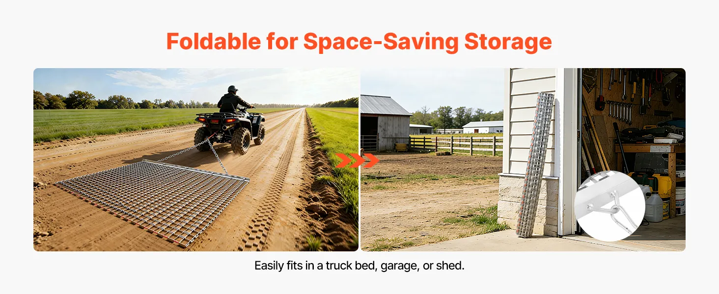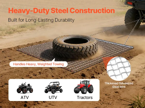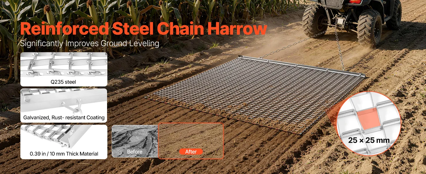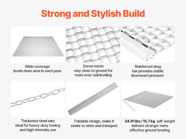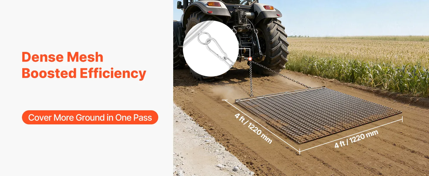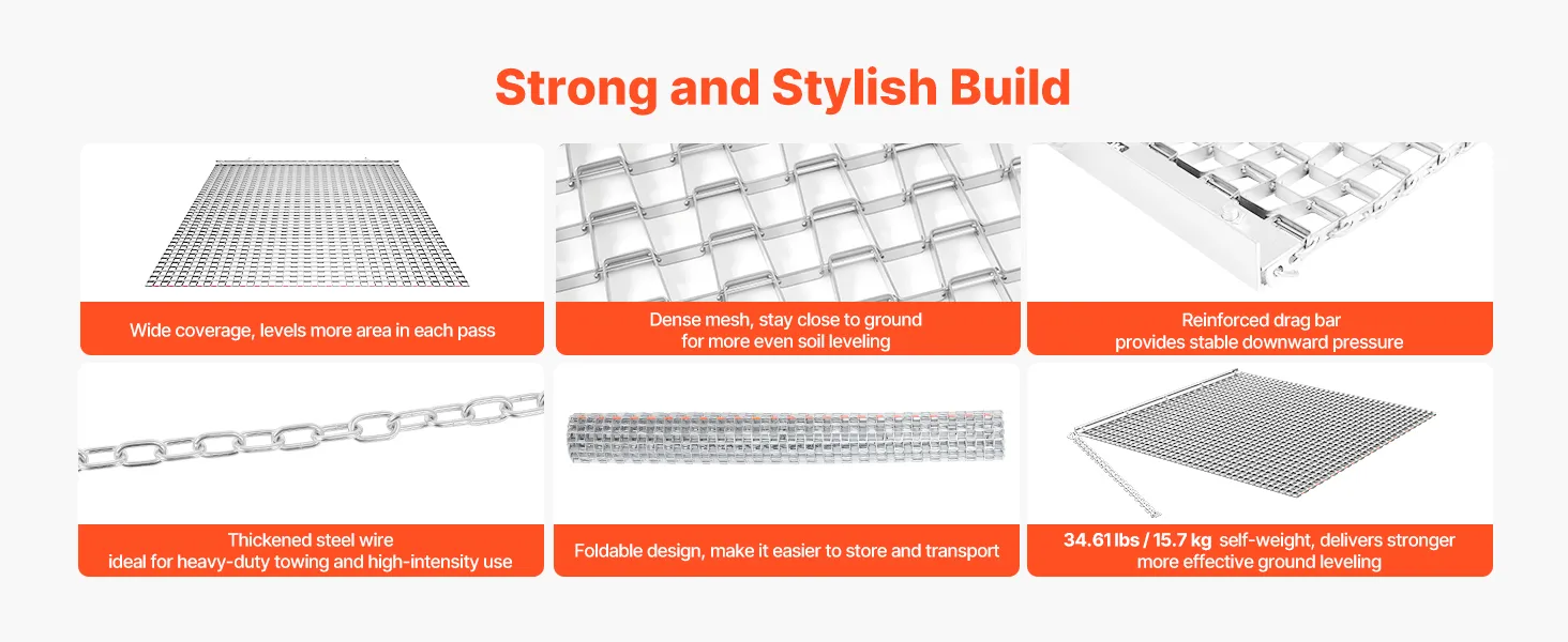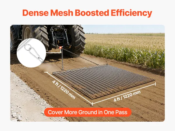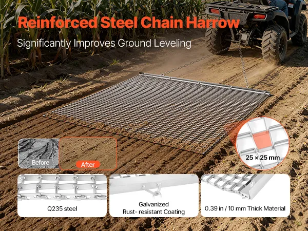 Heavy-Duty Steel Construction: Built with high-strength galvanized steel mesh and a reinforced frame, this chain harrow is long-lasting and durable. Ideal for driveways, lawns, and fields