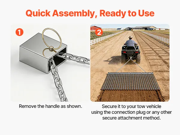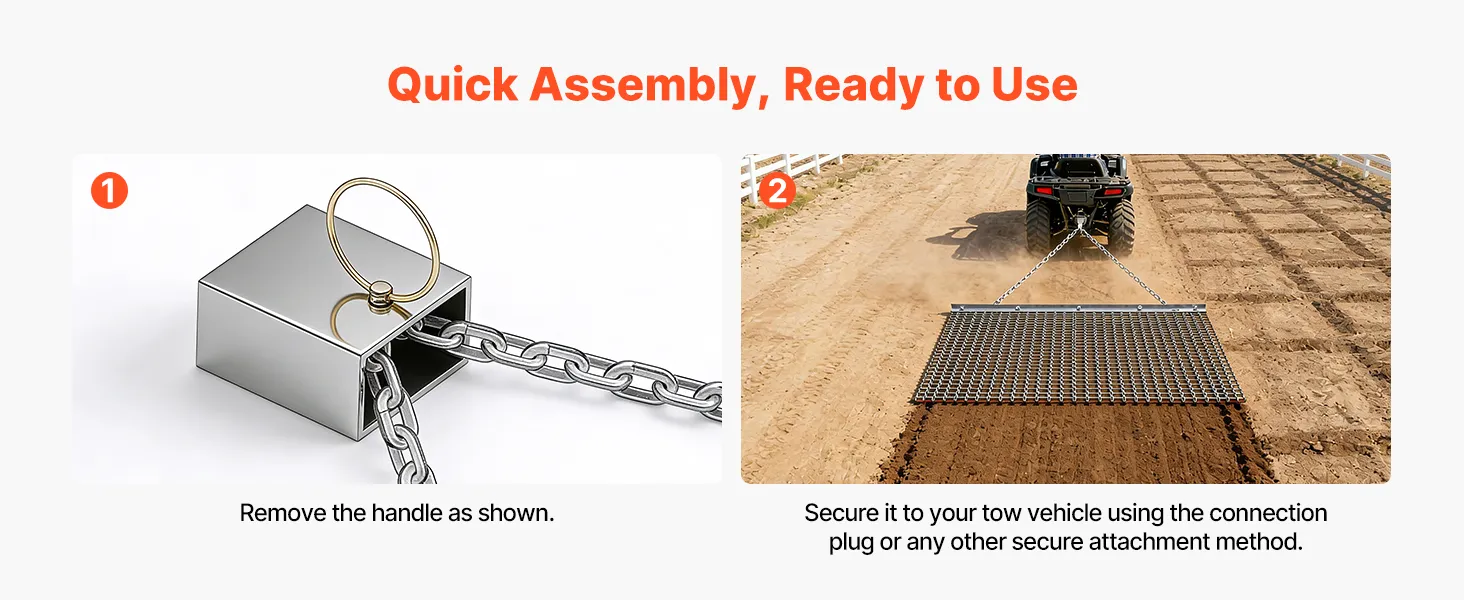 Easy to Assemble: With simple step-by-step installation of crossbars and chains, this atv drag harrow can be assembled quickly—even by first-time users