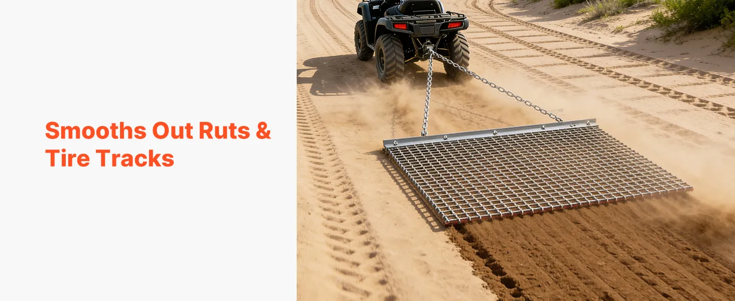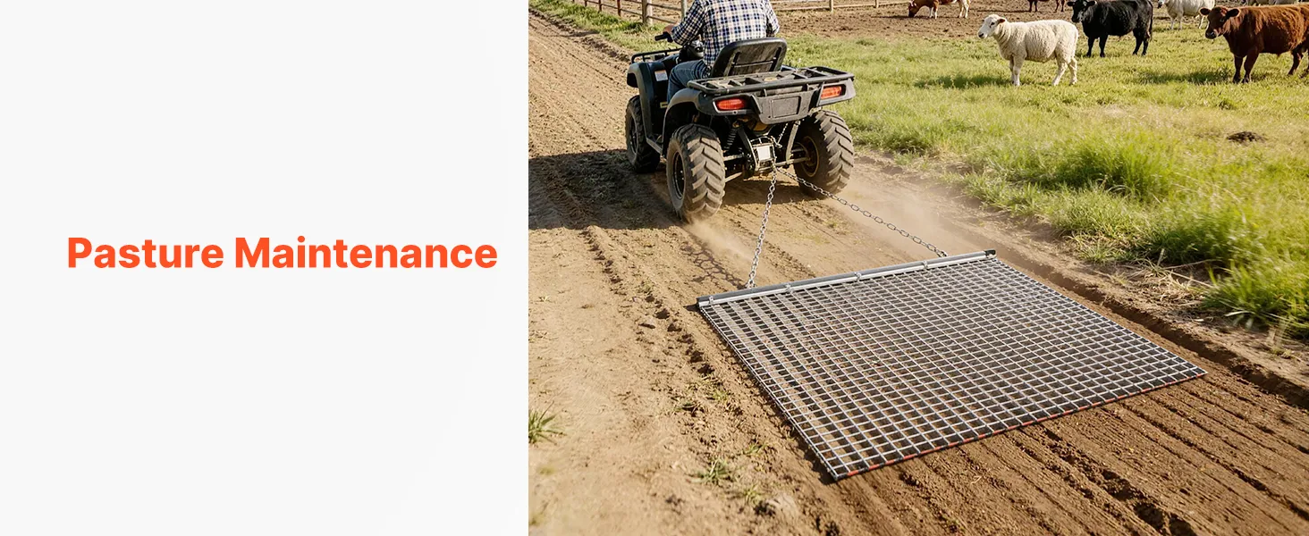 Efficient Leveling: This drag harrow features a thickened steel drag bar and rigid steel mesh that provide stable downforce to quickly smooth ruts and uneven ground