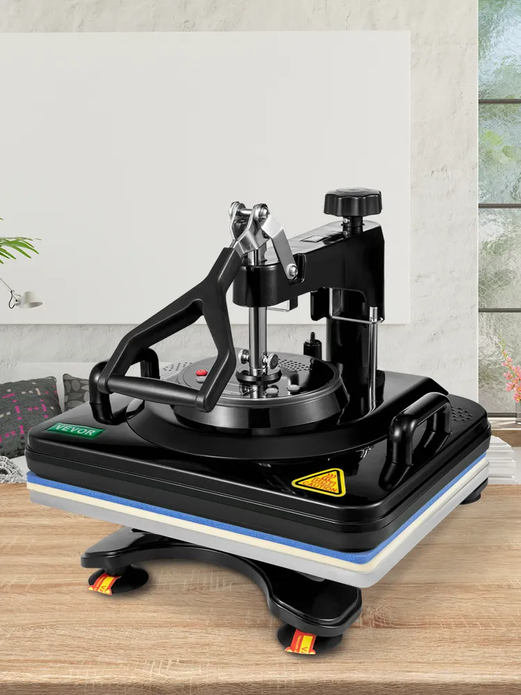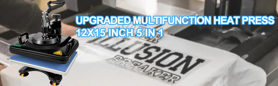 This 5 in 1 heat press printer with varieties of fittings, including one platen press, one hat/cap press, one mug press and one plate press, allowing patterns transfer onto T-shirts, caps, mugs, plates and other flat surfaced items.