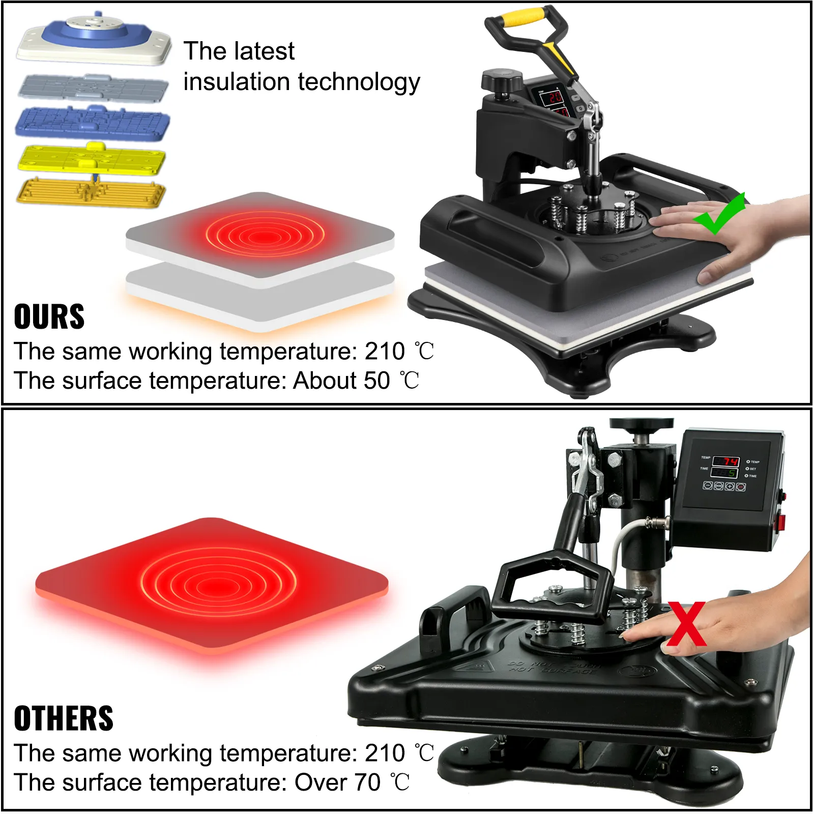 The latest two-layer insulation technology ensures that the sublimation heat press's surface temperature is only about 50 ℃ when the working temperature reaches 210 ℃.