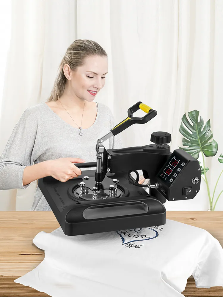This shirt printing machine has varieties of fittings, including one platen press, one hat/cap press, three mug press, one aluminum pot press, and two plate presses, allowing patterns to transfer onto T-shirts, caps, mugs, plates, and other flat surfaced items.
