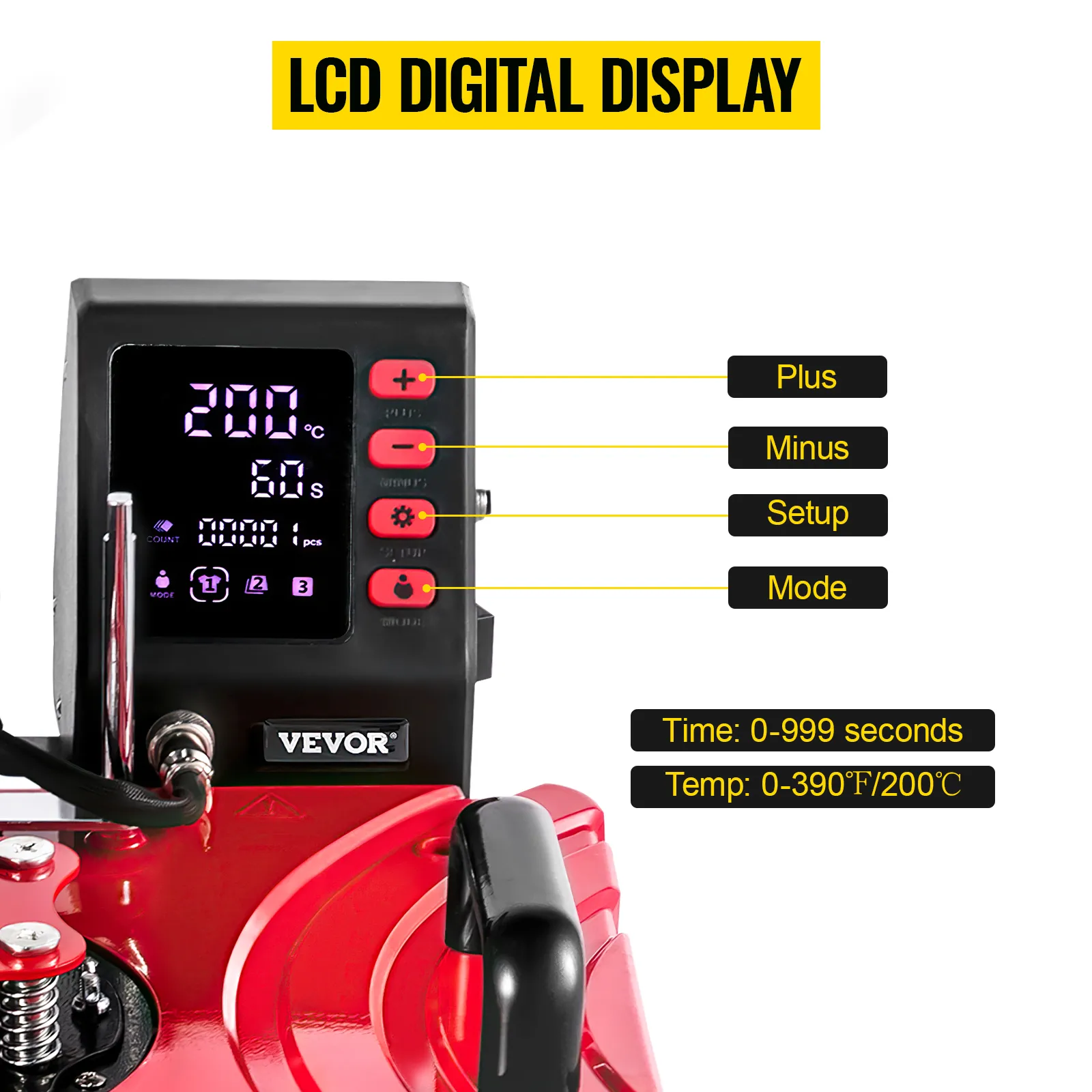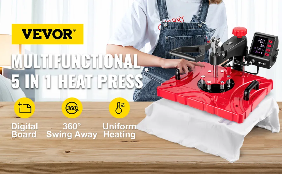 5-In-1 Versatile Kit: VEVOR 12" x 15" 5-in-1 heat press easily transfers clear images onto shirts, hoodies, mugs, caps, plates, ceramics, even glass. A great option for DIY uses or small business purposes, realizing your creative and personalized needs!