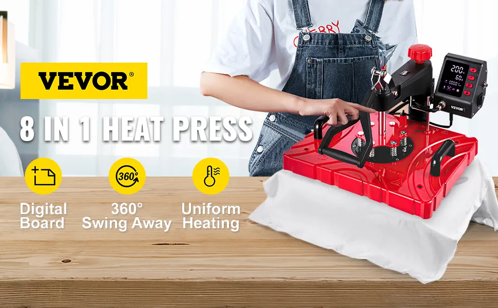 • 8-In-1 Versatile Kit: VEVOR 12" x 15" 8-in-1 heat press easily transfers clear images onto shirts, hoodies, cups, bottles, tumblers, caps, plates, ceramics, even glass. A great option for DIY uses or small business purposes, realizing your creative and personalized needs!