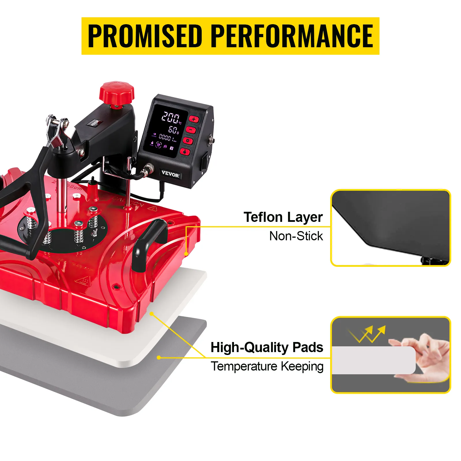 Non-stick teflon coated heat press platen offers tees extra protection with avoiding edge curling. Two thermal insulation pads improve the quality of transmission.