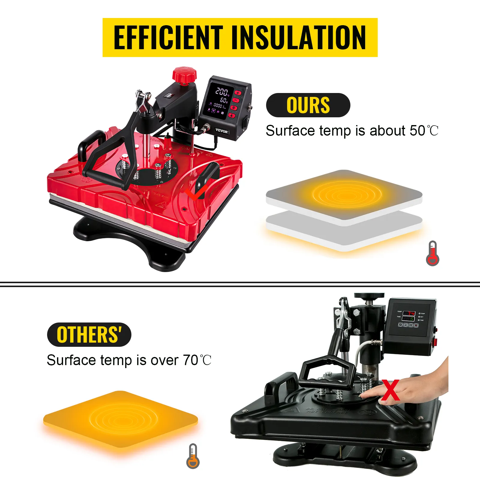 The t-shirt press's surface temperature is only about 50°C/122°F with our new composite shell and the latest two-layer insulation technology.