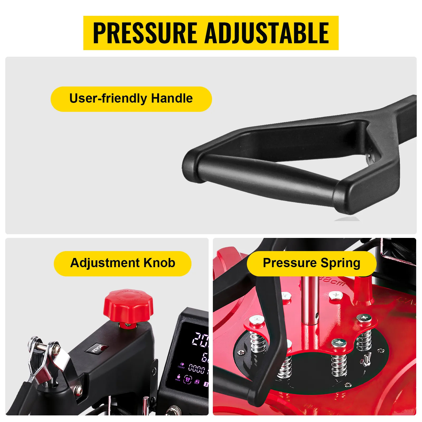 The adjustment knob and spring system easily applies the required pressure according to the thickness of transferring material. More evenly distributed across the shirt press platen.