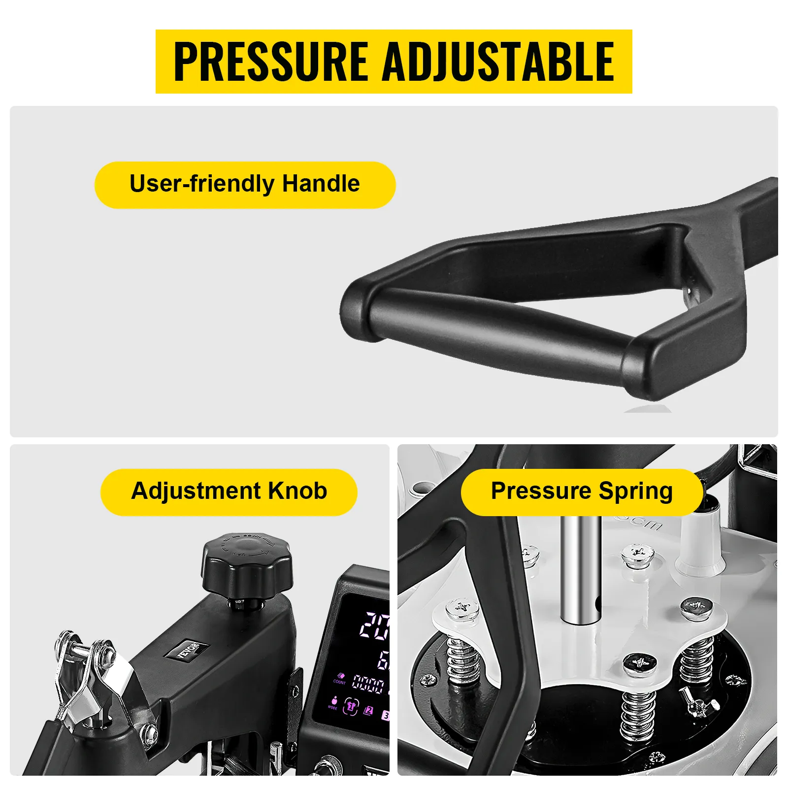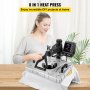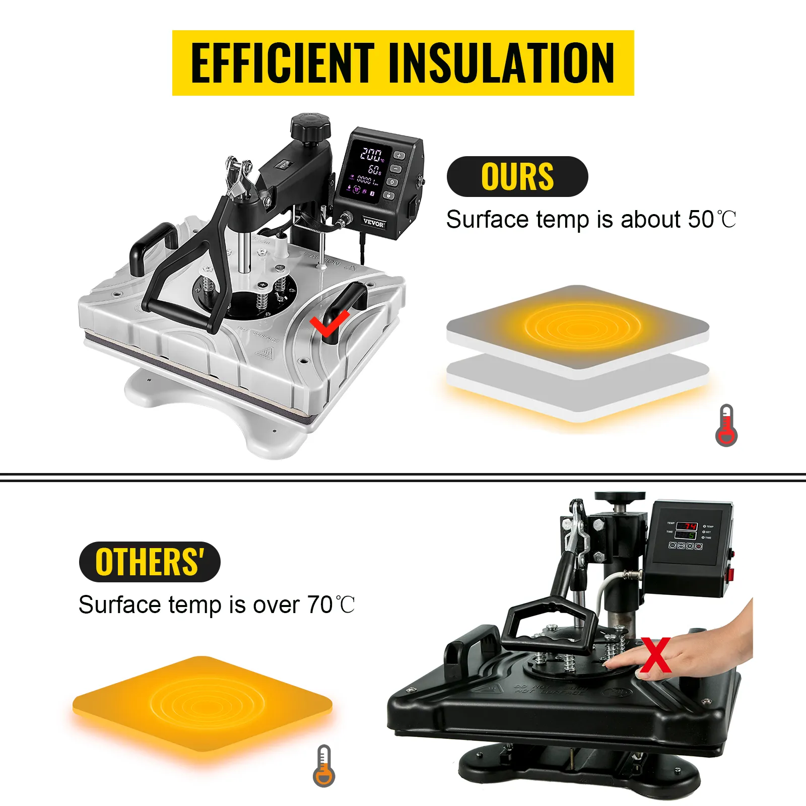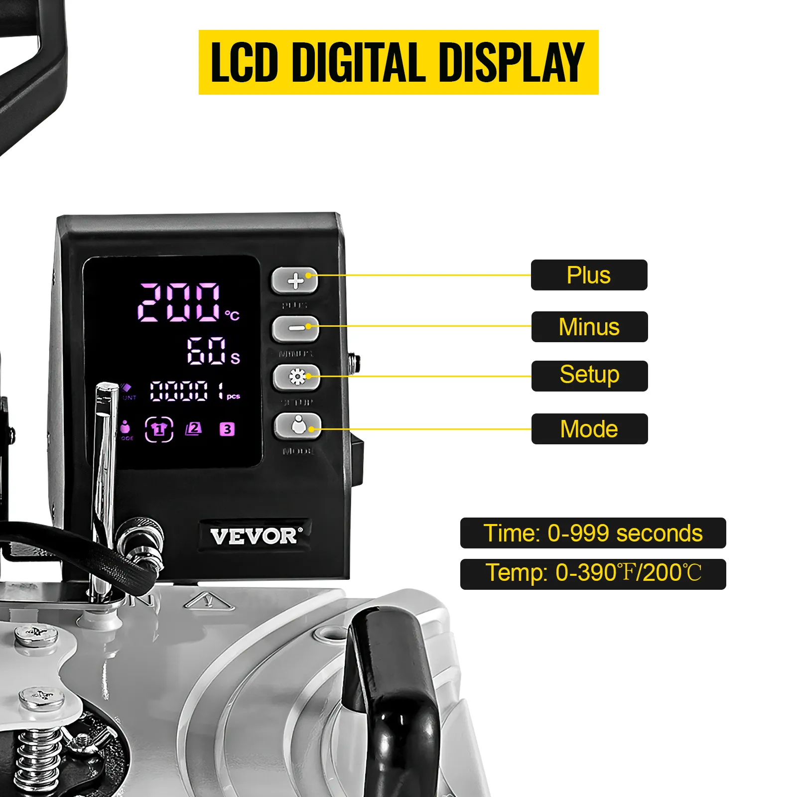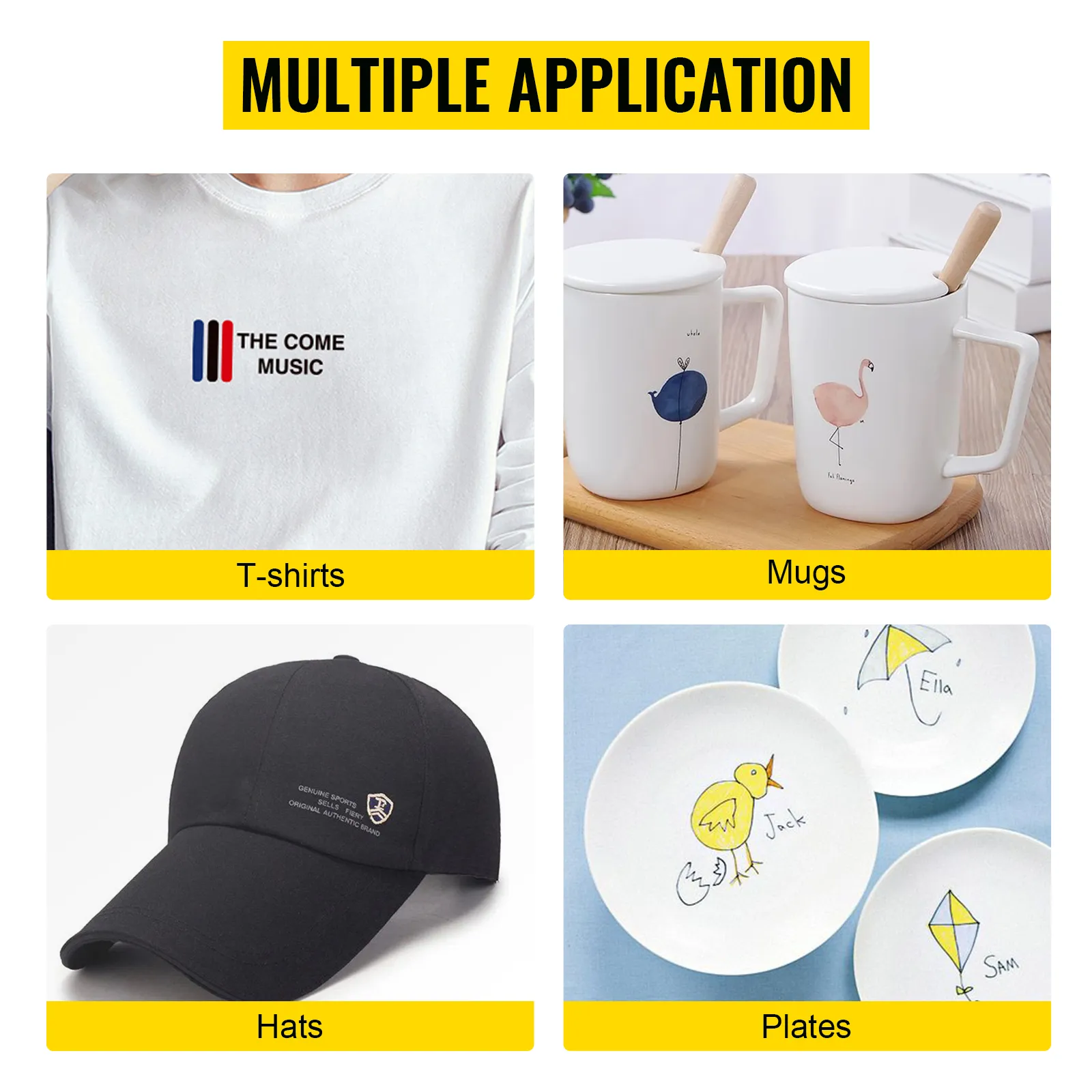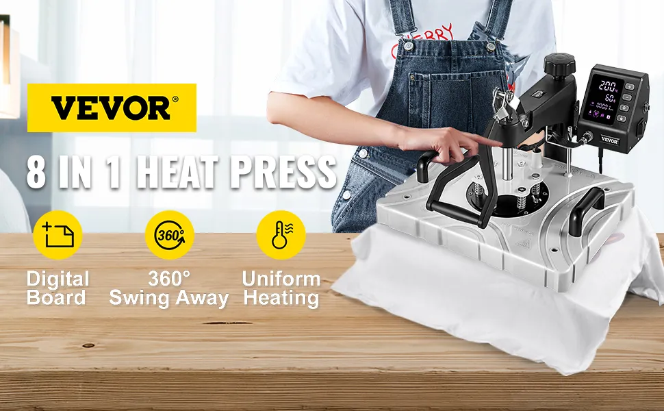 8-In-1 Versatile Kit: VEVOR 12" x 15" 8-in-1 heat press easily transfers clear images onto shirts, hoodies, cups, bottles, tumblers, caps, plates, ceramics, even glass. A great option for DIY uses or small business purposes, realizing your creative and personalized needs!