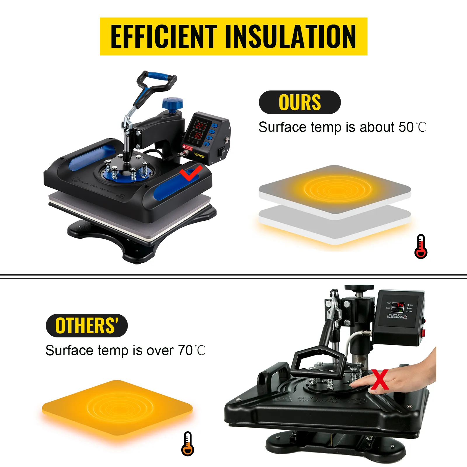 The t-shirt press's surface temperature is only about 50°C with our new composite shell and the latest two-layer insulation technology.