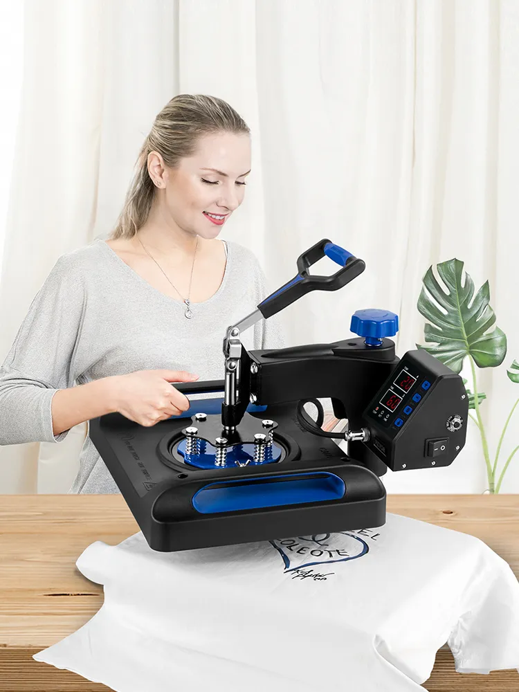 This shirt printing machine has varieties of fittings, including one platen press, one hat/cap press, three mug press, one aluminum pot press, and two plate presses, allowing patterns to transfer onto T-shirts, caps, mugs, plates, and other flat surfaced items.