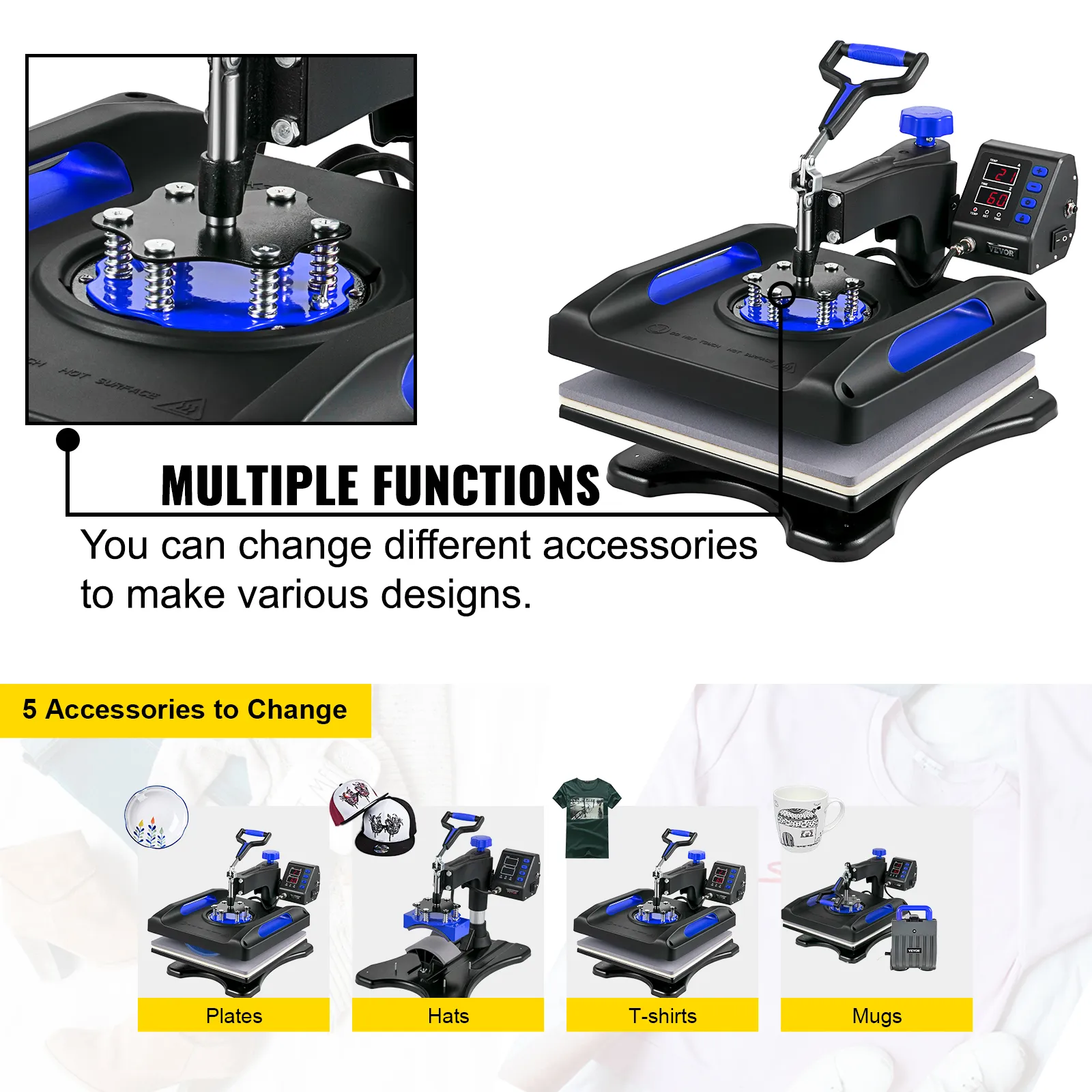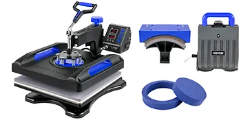 This shirt printing machine with varieties of fittings, including one platen press, one hat/cap press, one mug press, and two plate presses, allowing patterns to transfer onto T-shirts, caps, mugs, plates, and other flat surfaced items.