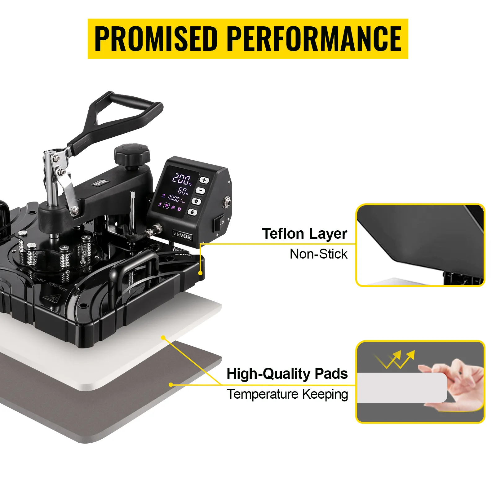 Non-stick teflon coated heat press platen offers tees extra protection with avoiding edge curling. Two thermal insulation pads improve the quality of transmission.