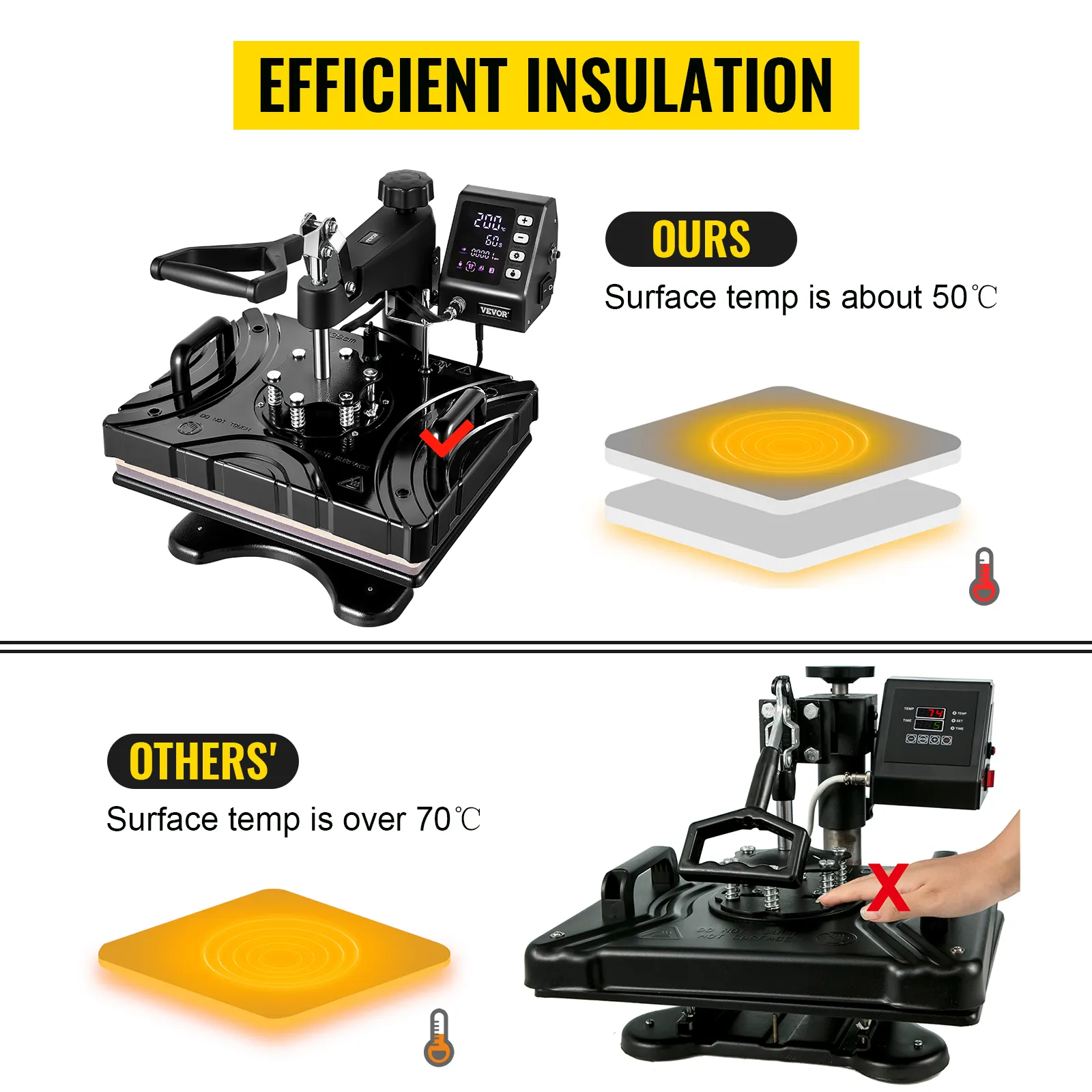 The t-shirt press's surface temperature is only about 50°C/122°F with our new composite shell and the latest two-layer insulation technology.