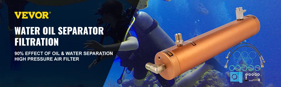 The water-oil separator is made of aviation-grade aluminum alloy shell with base for durability and stability. It boasts a high-pressure filter system that 90% of water and oil can be filtered out. It is compatible with many kinds of air compressors, such as diving compressors.