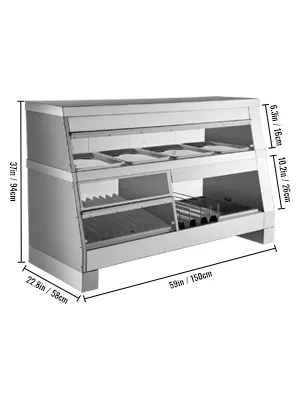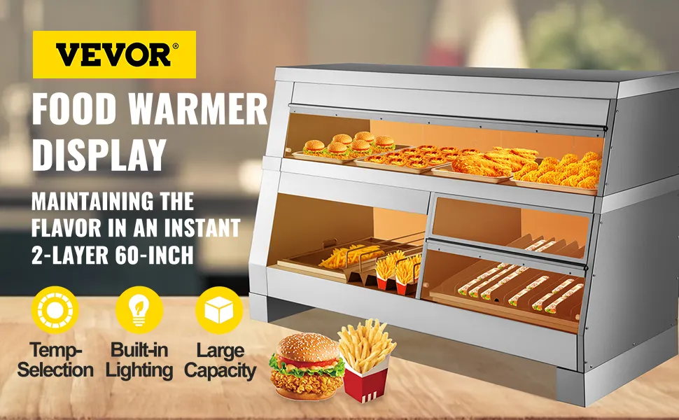 Made from sturdy stainless steel and acrylic material, our commercial food warmer is simple to clean and built to last. The 60-inch length provides enough space for you to hold varieties kinds of food. With temperature 57-185℉ (20-85℃) adjustable, it can control the temperature of each layer independently. Besides, the front and rear doors can be opened by customers and staff to boost efficiency. All the above make this food warmer perfect for bakeries, cafés, fast food restaurants, etc.