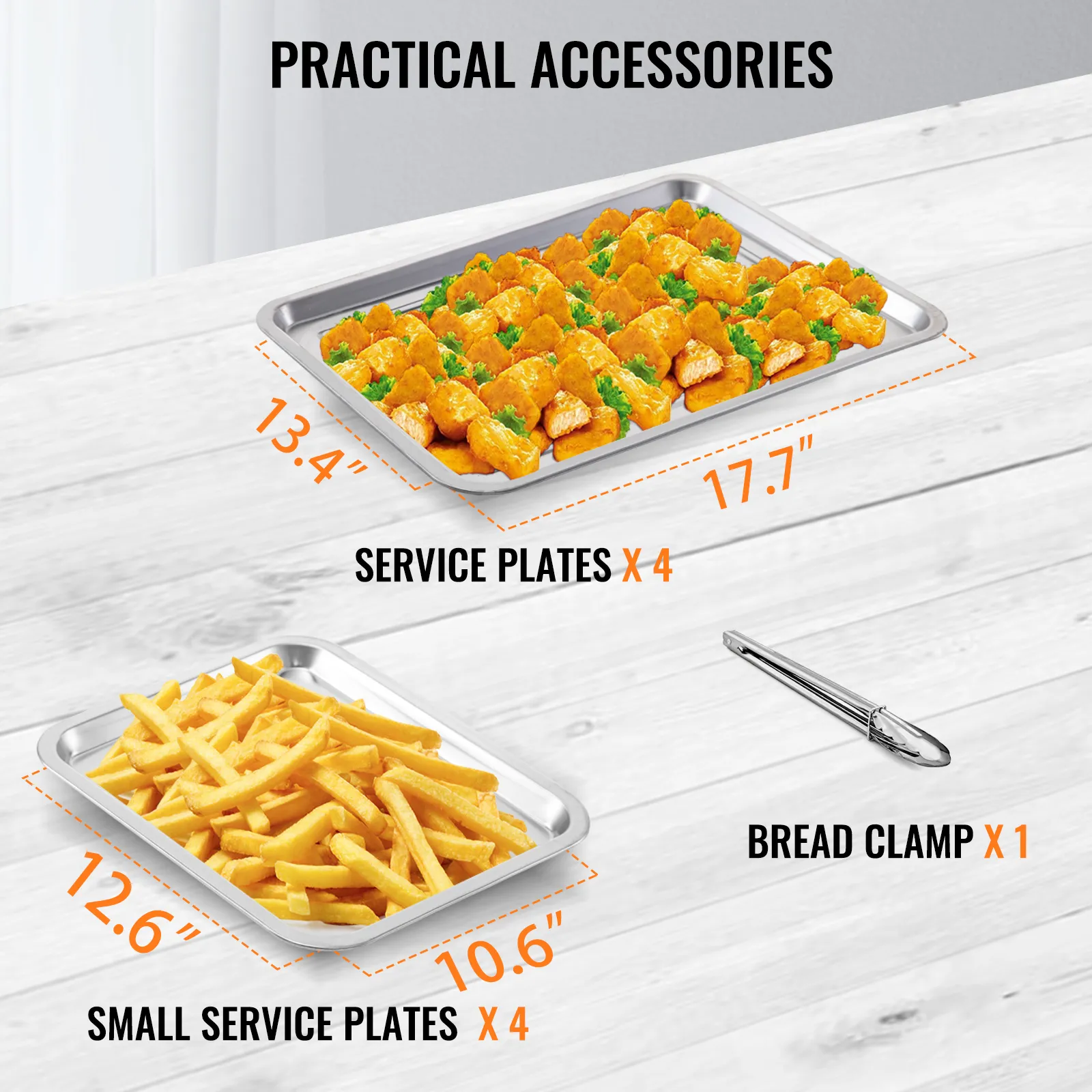 This food warmer display will come with three kinds of accessories, including four service plates (17.7" x 13.4" x 0.79" each), four small service plates (12.6" x 10.6" x 0.79" each) and a bread clamp. Trays in different sizes are available to hold diversified foods.