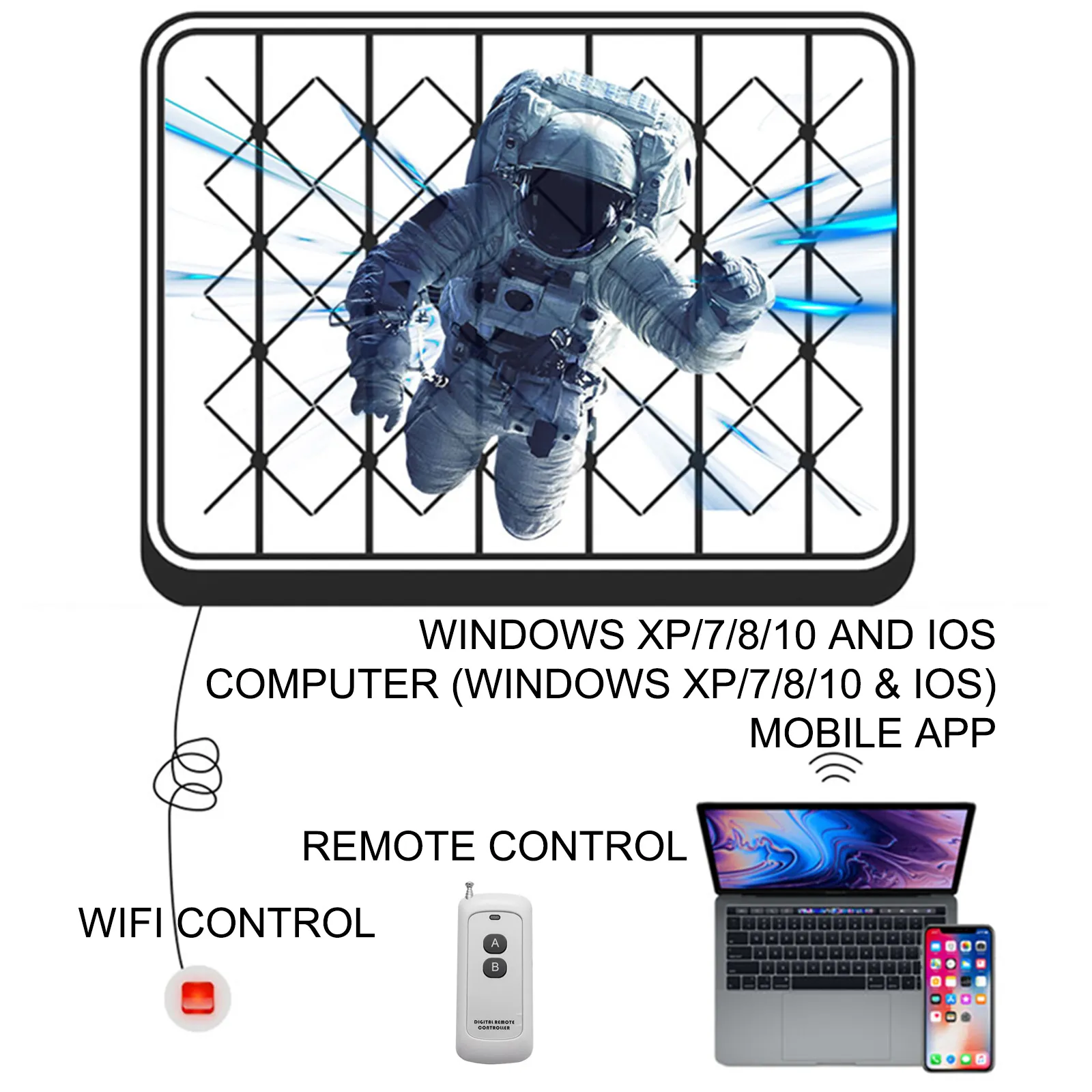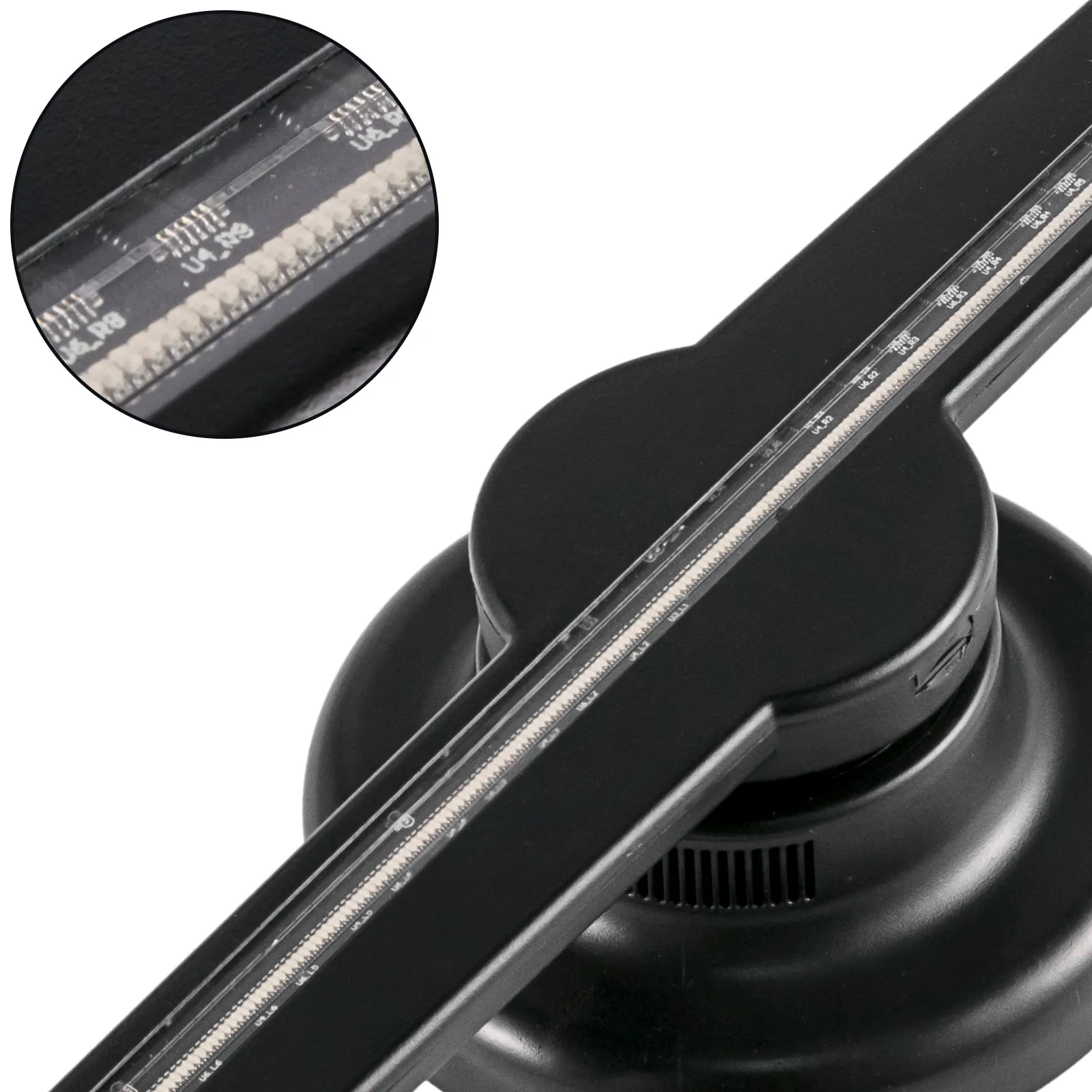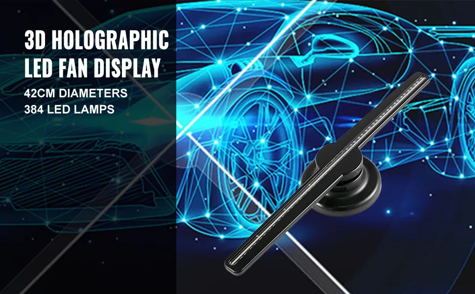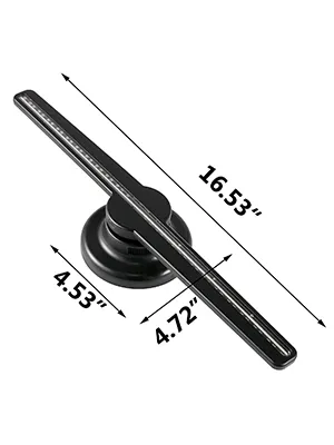A realistic holographic 3D effect makes you feel it completely appears in the air and creates an eye-catching attractive being. 42 cm long fan blades from a large-screen playback. 384 professional HD LED lamp beads to bring stunning light and incredible looking images, a good choice for shopping malls, restaurants, stages, and exhibition halls to catch attention.