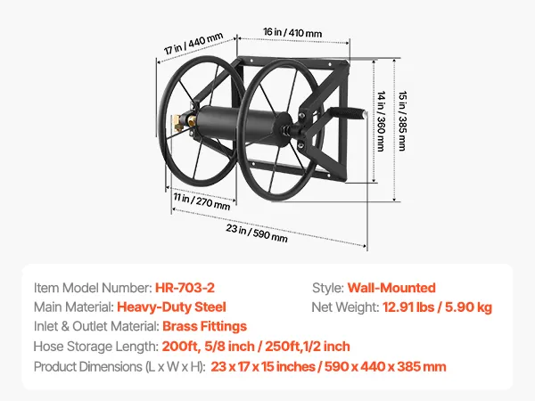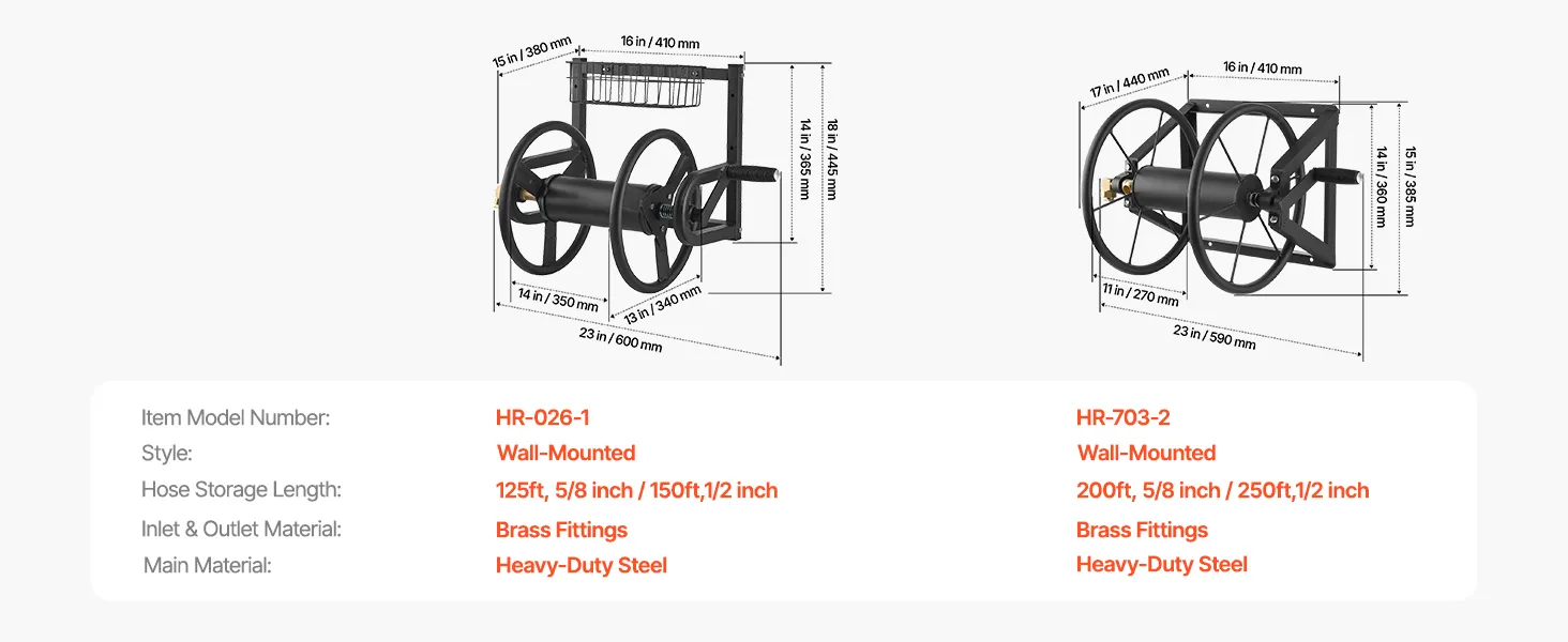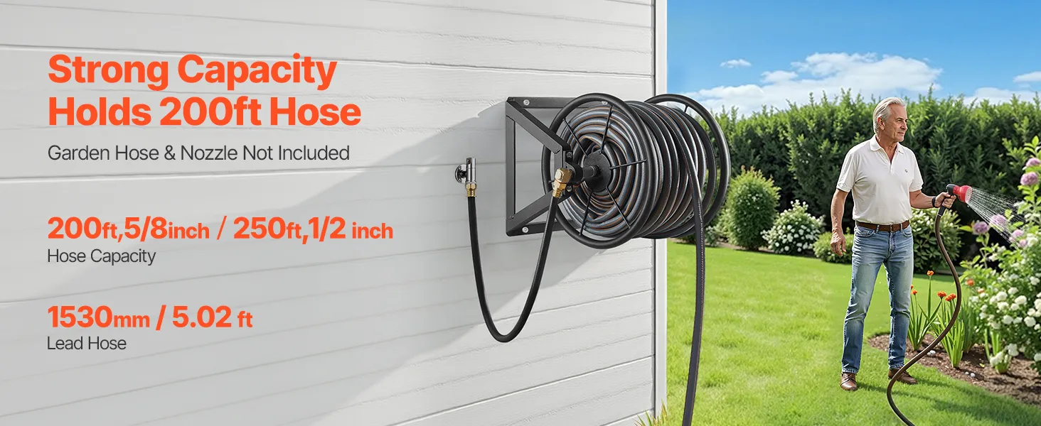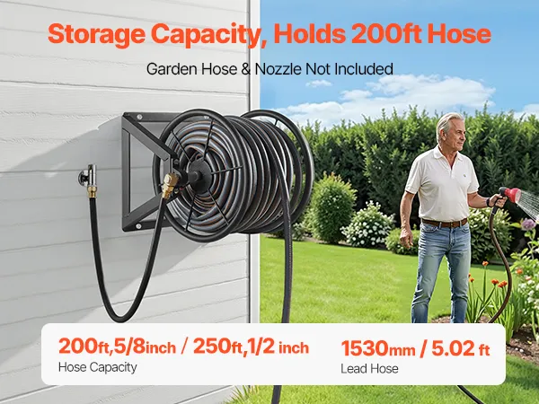 High Capacity Storage: This garden hose reel is designed to store hoses up to 200 ft, 5/8 in or 250 ft, 1/2 in(hose not included), and comes with a 5.02 feet lead hose. With enough length, it is ideal for watering a large garden or washing your car.