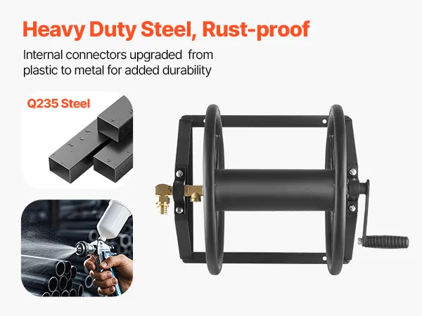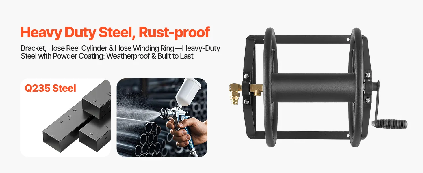 Durable & Long-Lasting: Made from corrosion and rust-resistant steel, heavy-duty water hose reel is designed to withstand various weather conditions. Whether exposed to the sun, rain, or cold winter, this metal hose reel ensures stability and durability.