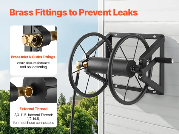 Premium Brass Fittings: Equipped with brass inlet and outlet fittings, it ensures smooth water flow and prevents leakage. The hose reel features a three-way connector with 3/4-11.5 external threads and 1/2-14.5 internal thread, precisely matching most standard hose connectors.