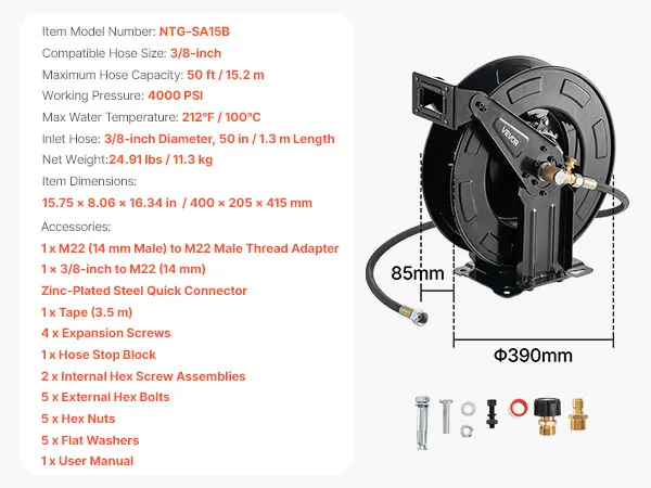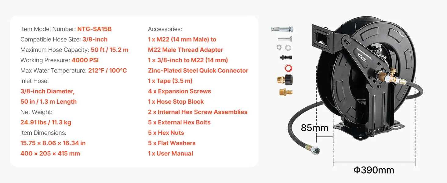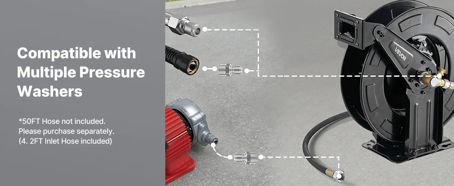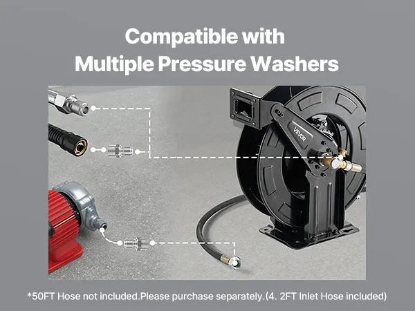 Compatible with 50FT Hose: Designed for 3/8-inch hoses up to 50 feet (M22 connector), supports up to 4000 PSI and 212°F. Compatible with most pressure washer hose reel systems (hose not included), meeting a wide range of high-pressure cleaning needs