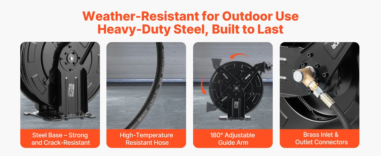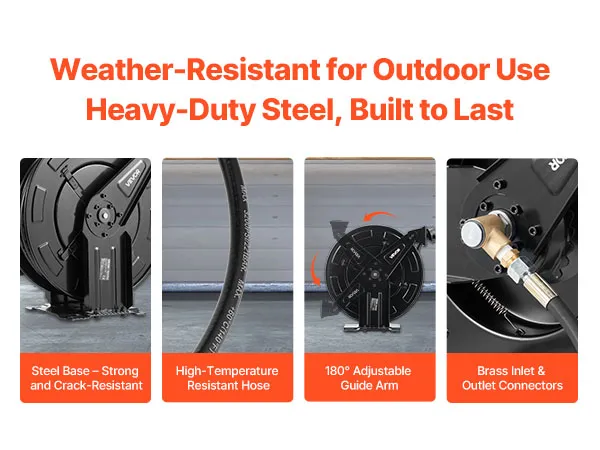 Made of strong steel with heat-resistant hoses and brass inlet/outlet connectors. The reinforced steel base stands up to harsh outdoor conditions, addressing common durability problems in traditional hose reels.
