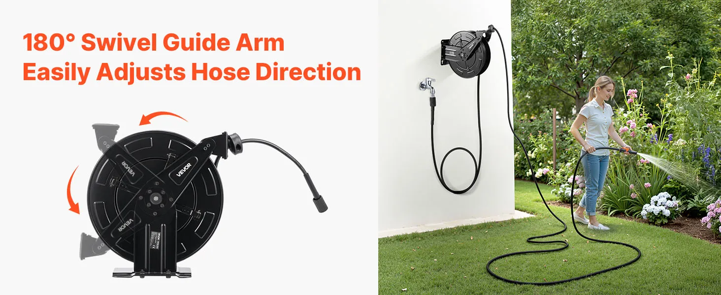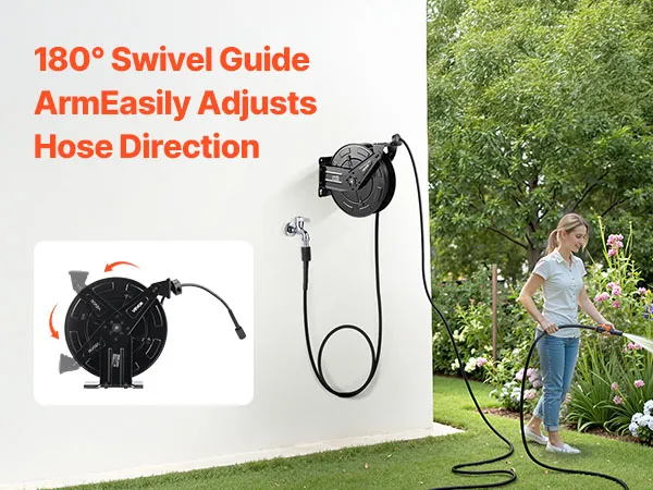 Flexible Adjustment: The adjustable guide arm allows precise hose locking at various lengths without continuous pulling. Combined with an anti-collision design, it avoids hose tangling, extending the service life of your pressure washer hose reel