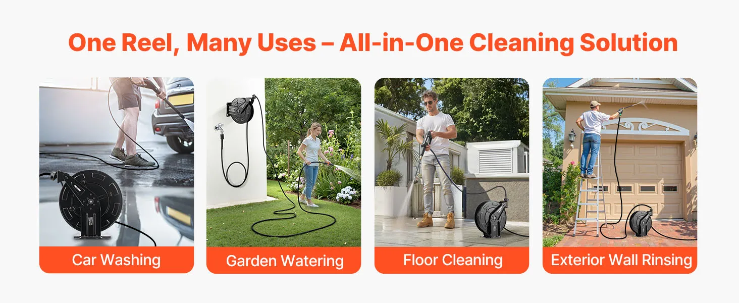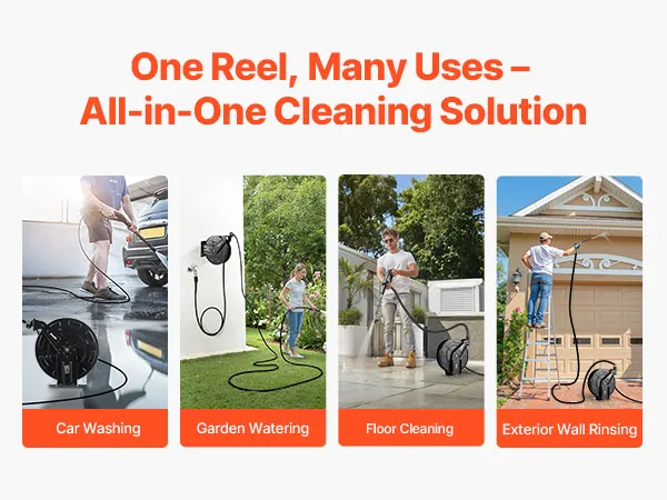 Suitable for car washing, garden irrigation, ground cleaning, and exterior wall washing. A one-stop hose storage solution for multiple cleaning tasks, enhancing convenience.