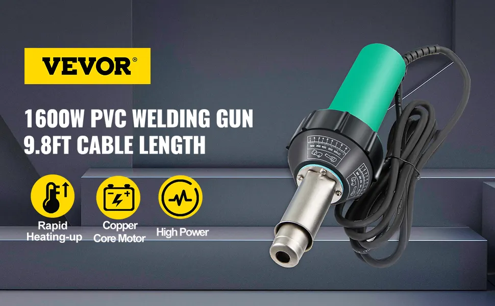 This hot-air plastic welding gun can weld thermoplastic materials, and it can shape and bend thermoplastic materials by producing a jet of hot air that softens the parts to be joined and the plastic filler rod. It is suitable for welding, grooving, maintenance, and construction work of PVC floor, rubber floor, and other floors.