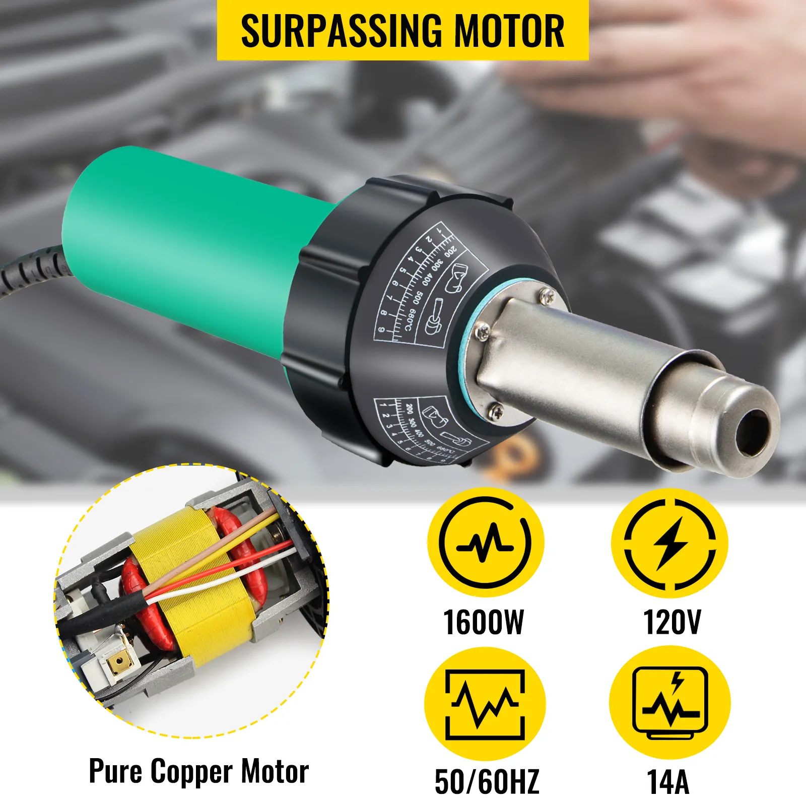 The pure copper motor comes with the power of 1600W and is equipped with many kinds of welding nozzles to renovate the roof, maintain the tunnel, mend the tarpaulin, and advertising cloth