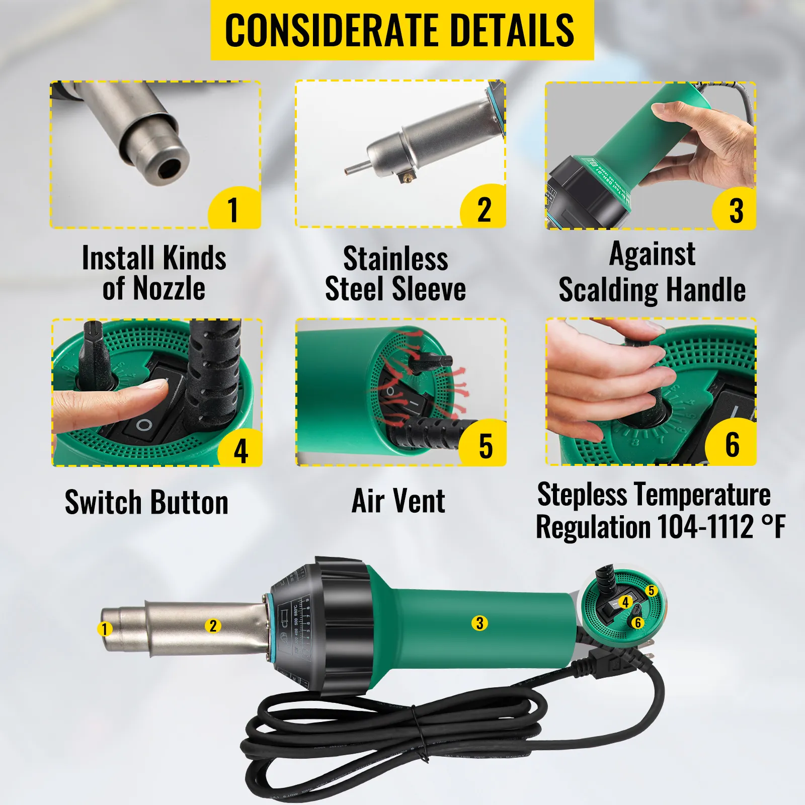 Significant nozzles make you available to welding many types of materials. In addition, a carefully selected heating core ensures the outstanding heating function of our PVC heat gun.