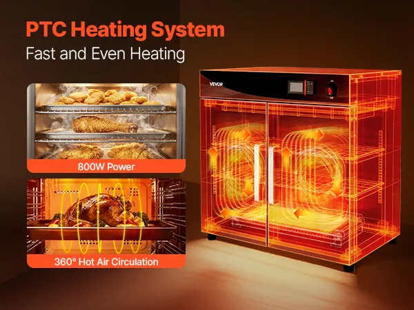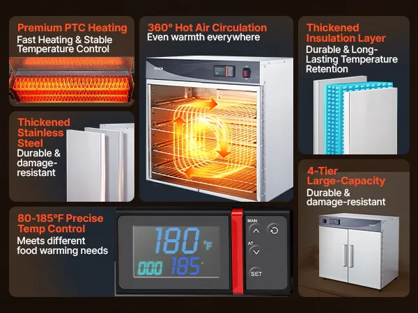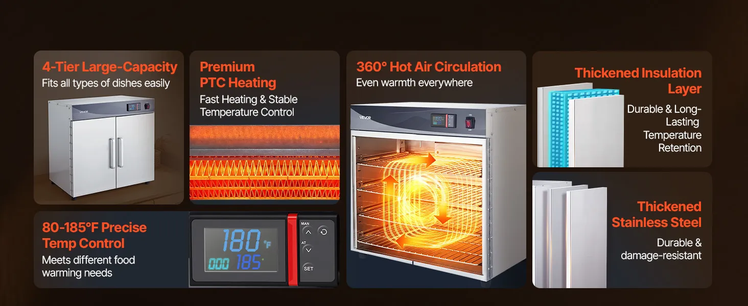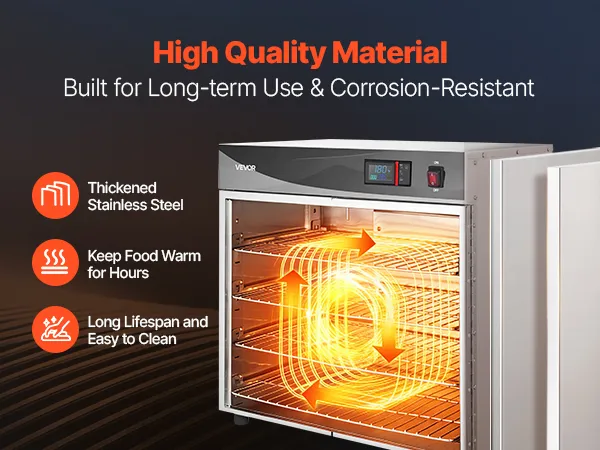 Excellent Heat Retention: Constructed with thickened stainless steel and a tight door seal to minimize heat loss. 360° hot air circulation provides even heating while maintaining high energy efficiency for reliable holding