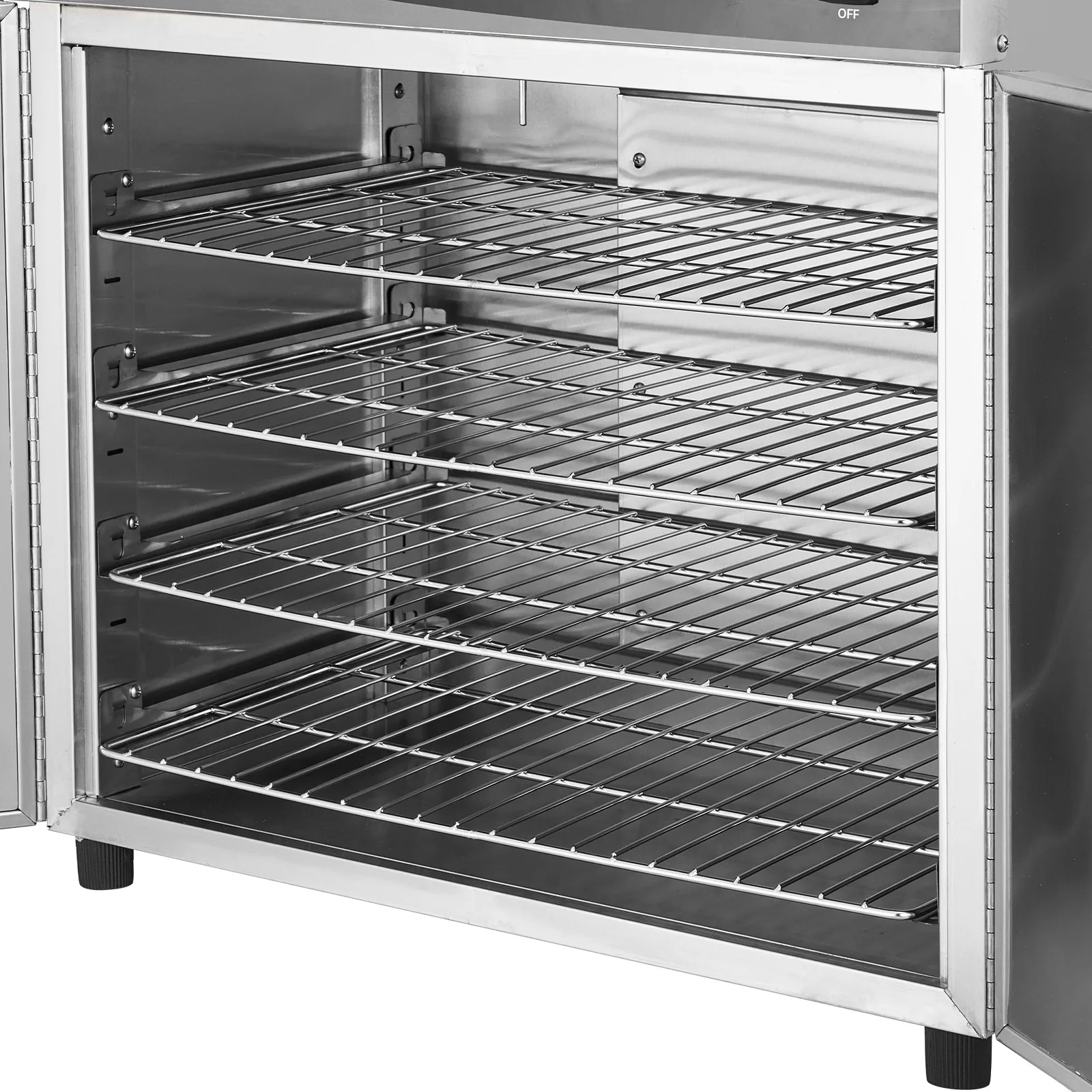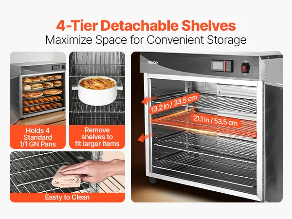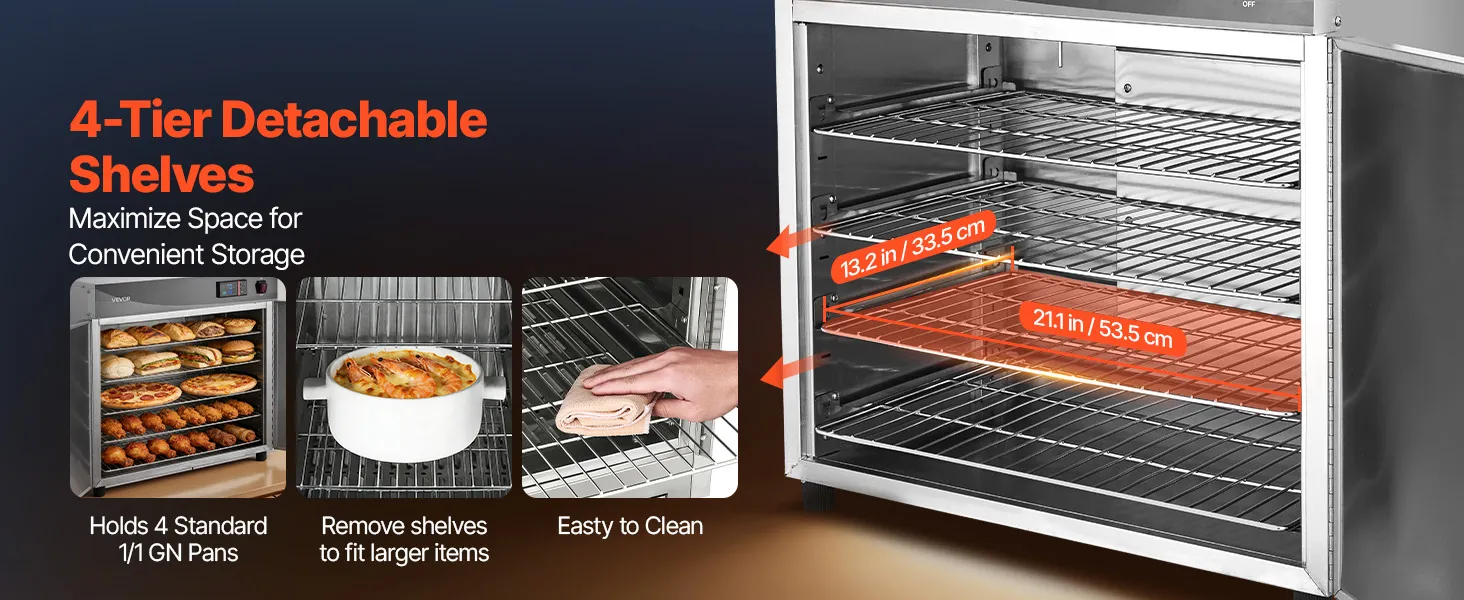 4-Layer Flexible Capacity: Features four sturdy, removable shelves with 3.7 inch/9.5 cm clearance per tier, designed to accommodate 13 inch pizzas, full-size hotel pans, and various trays. The adjustable shelving allows for custom configurations to fit taller items