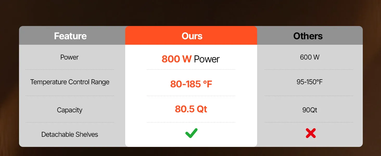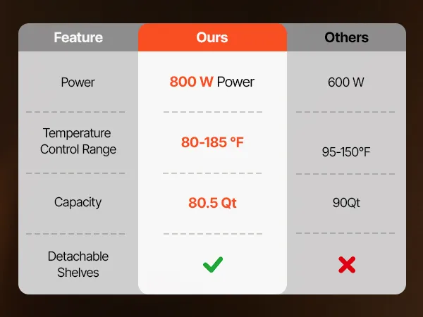 Precise Control with Added Protection: Offers adjustable temperatures from 80°F to 185°F, featuring auto shut-off and overheat protection. Includes a removable water tray to prevent food from drying out or scorching during operation